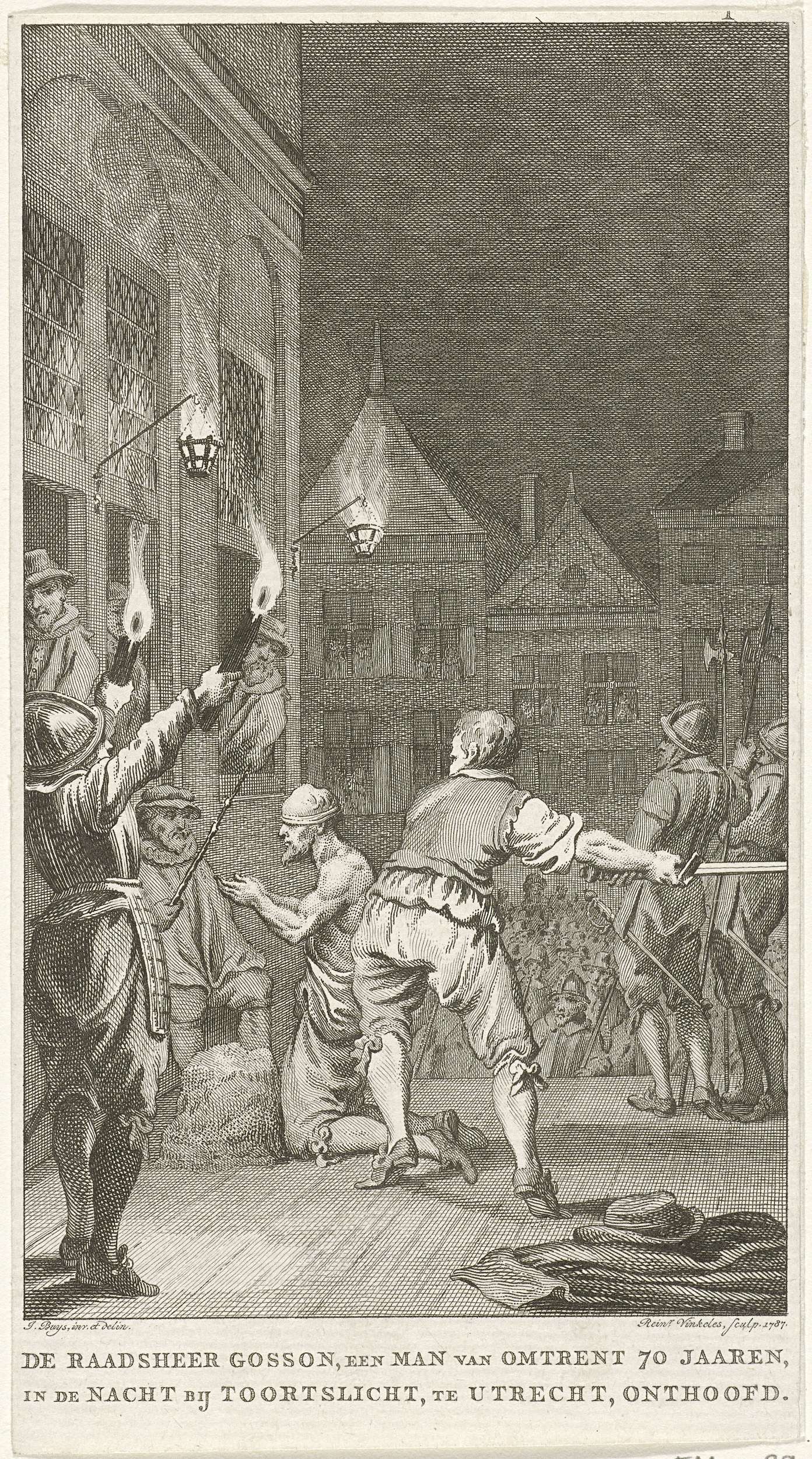 Onthoofding van de raadsheer Nicolas Gosson te Atrecht, wegens sympathie met de Malcontenten, 26 oktober 1578. Gosson knielt op het schavot op een plein.
