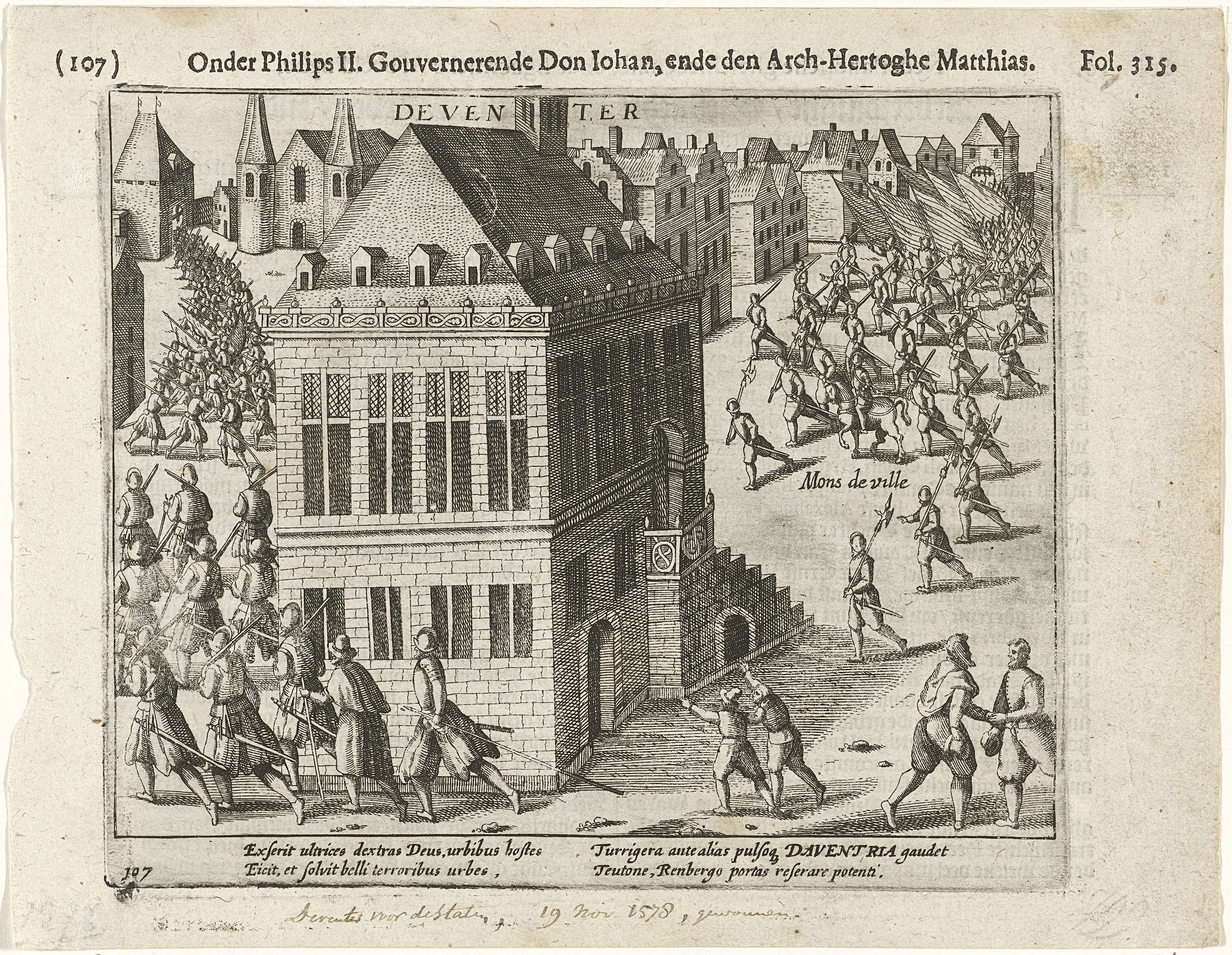 Overgave van de stad Deventer na belegering door het Staatse leger onder de graaf van Rennenberg, 19 november 1578. Links de aftocht van het Duitse garnizoen. Met onderschrift van 4 regels in het Latijn. Genummerd: 107. Bedrukt op achterzijde met tekst in het Nederlands.