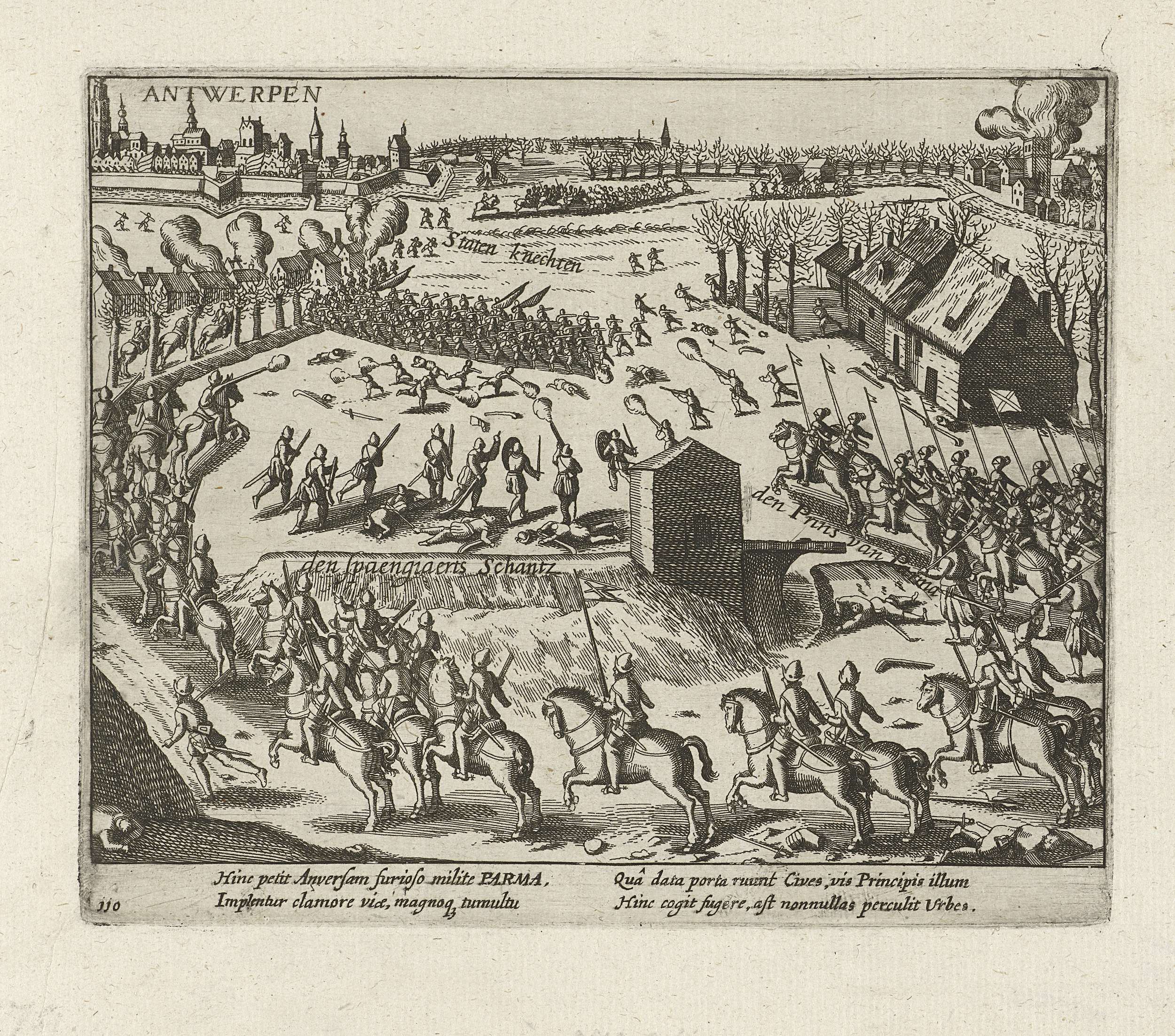 Slag bij Borgerhout bij Antwerpen, 2 maart 1579, tussen het Staatse leger en het leger van de hertog van Parma. Op de voorgrond Spaanse ruiters en een Spaanse schans, links de brandende huizen van Borgerhout in de verte Antwerpen. Met onderschrift van 4 regels in het Latijn. Genummerd: 110. Onbedrukt op achterzijde.