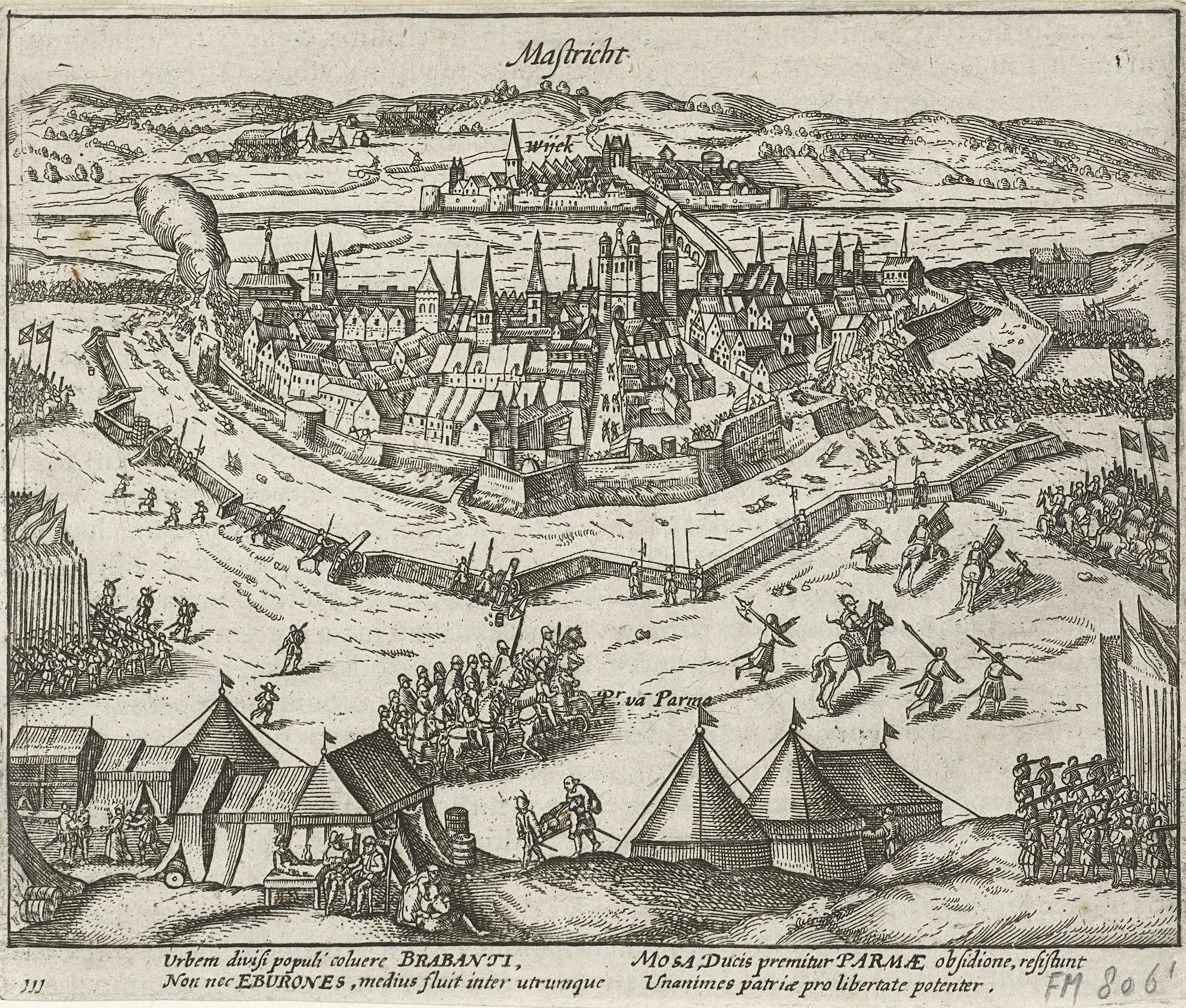 Belegering van de stad Maastricht door het leger van de hertog van Parma, april 1579. Op de voorgrond de legerkamp van de Spanjaarden, in de verte de belegerde stad. Met onderschrift van 4 regels in het Latijn. Genummerd: 111. Bedrukt op achterzijde met tekst in het Latijn.