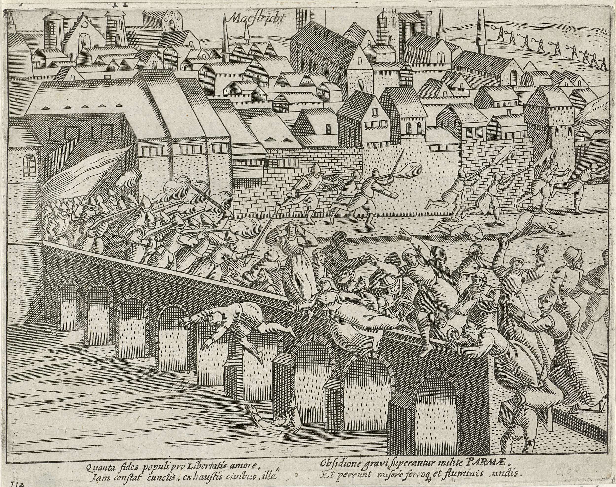 Maastricht ingenomen en geplunderd door het leger van de hertog van Parma, 29 juni 1579. Gezicht op de brug over de Maas waar velen in het water springen in een poging hun leven te redden. Op de achtergrond trekken de soldaten moordend door de stad. Met onderschrift van 4 regels in het Latijn. Genummerd: 112. ...