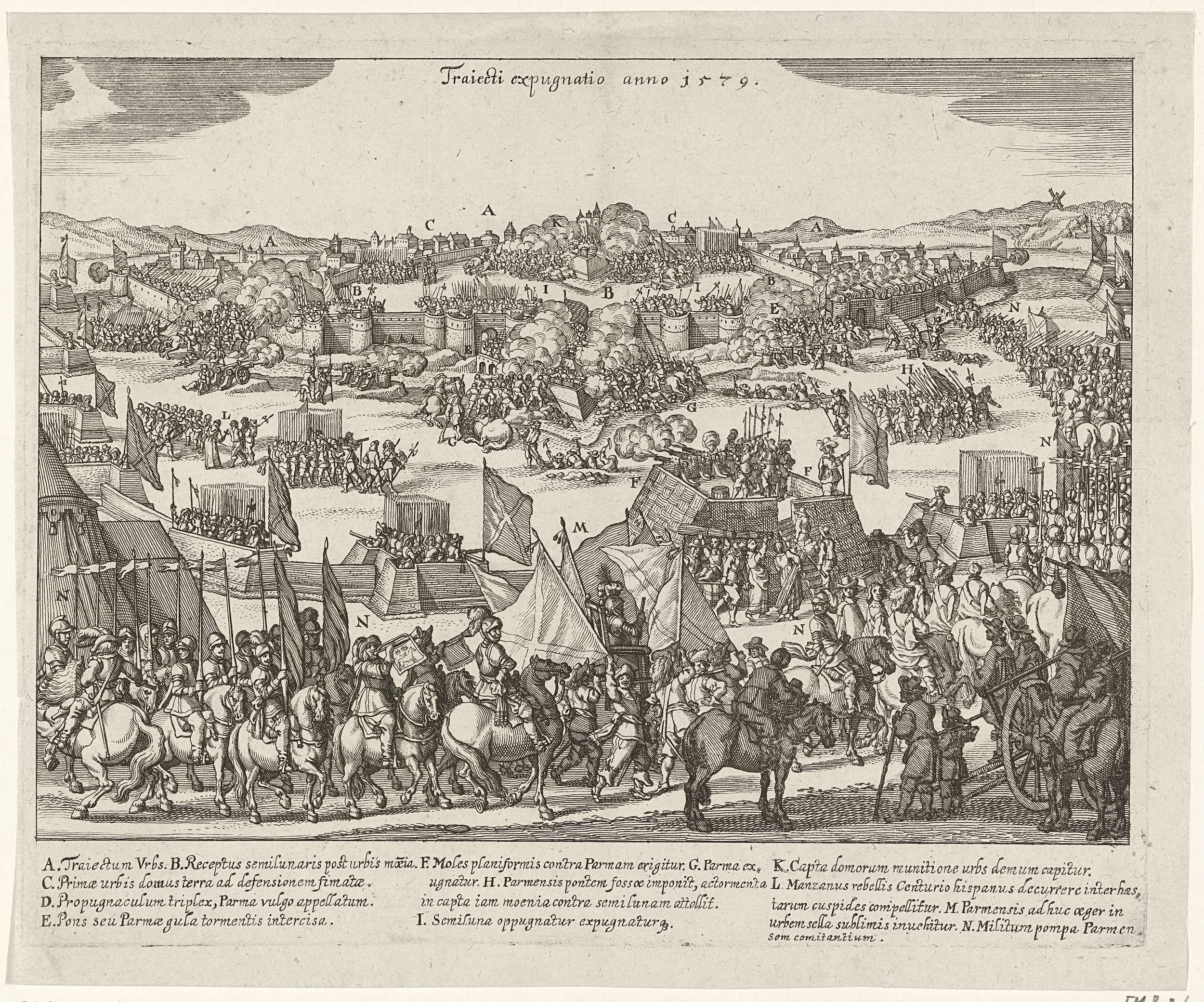 Maastricht na beleg veroverd door het leger van Parma, 29 juni 1579. Voor de stadsmuren wordt nog geschoten en gevochten. Op de voorgrond de stoet met de hertog van Parma in een draagstoel die naar rechts en de stad in trekt. In het onderschrift de legenda A-N in het Latijn.