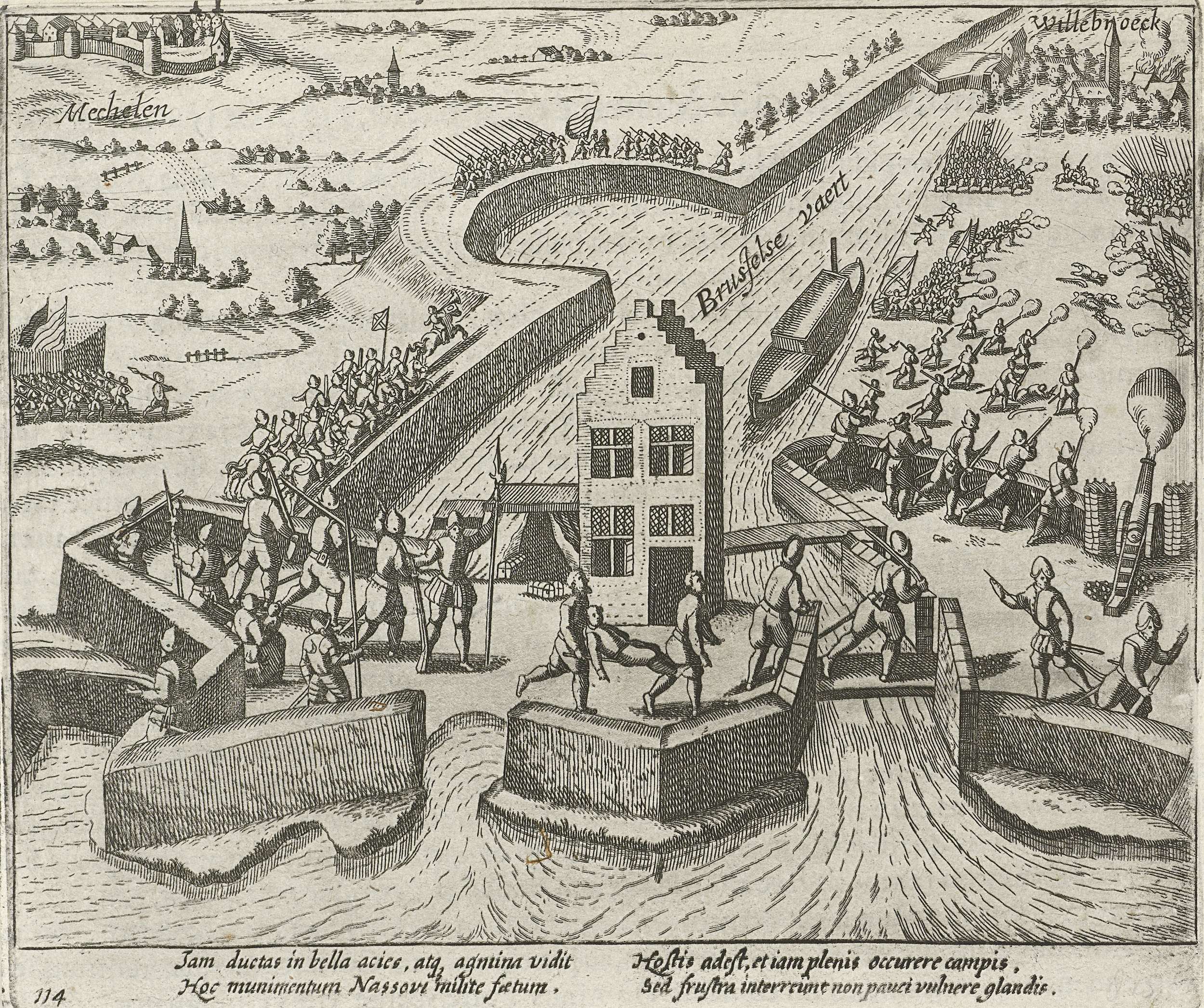 Verovering van de schans bij de sluizen van Willebroek door de Staten, 19 september 1579. Op de voorgrond de ingenomen schans, op de achtergrond gevechten bij het plaatsje Willebroek en de Brusselse vaart. Met onderschrift van 4 regels in het Latijn. Genummerd: 114. Bedrukt op achterzijde met tekst in het Latijn.