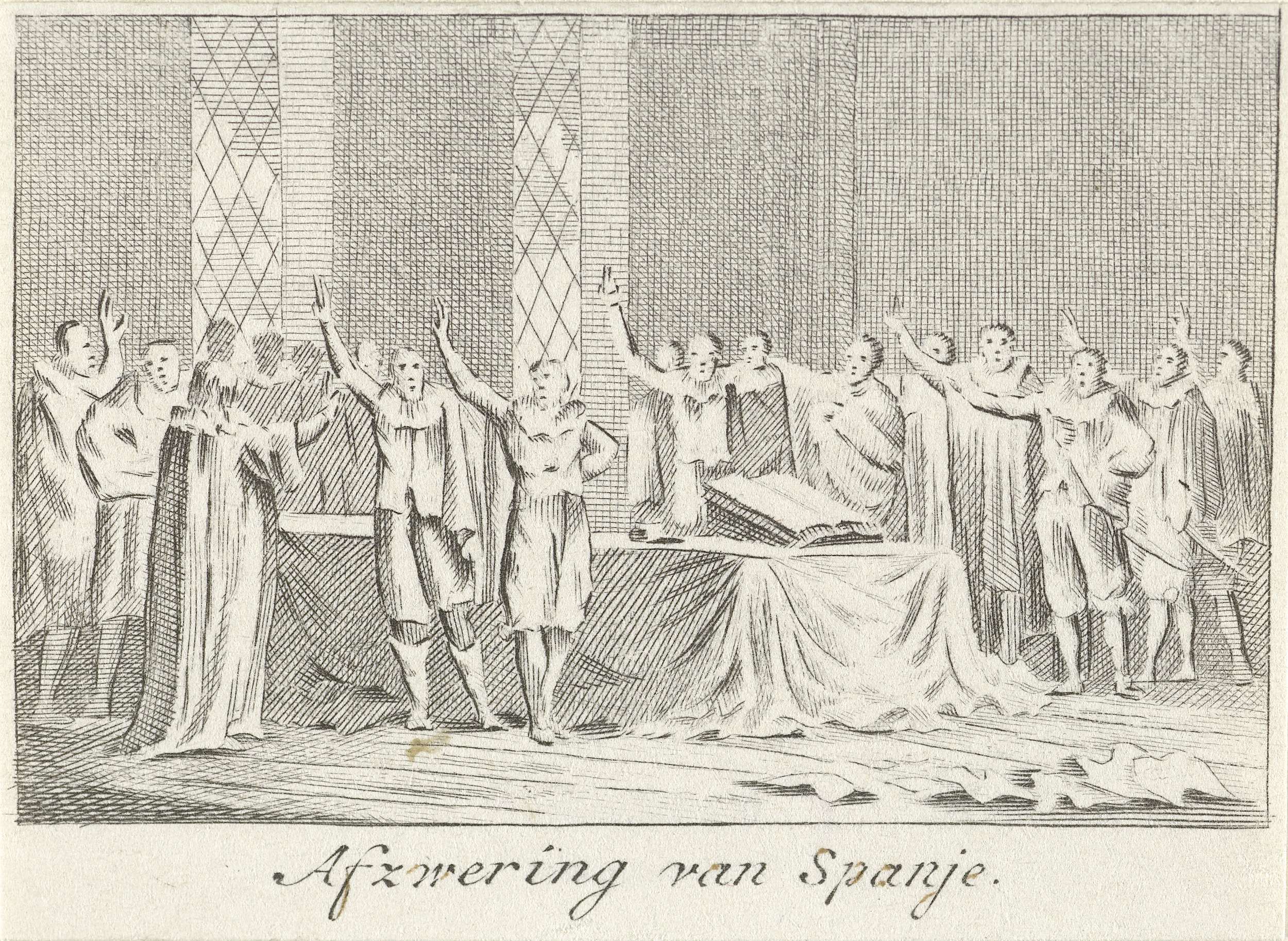 Kleine voorstelling van het afzweren van de Spaanse koning Filips II door de Staten, 26 juli 1581. Interieur waarin een grote groep van leden van de Staten-Generaal de eed afleggen.