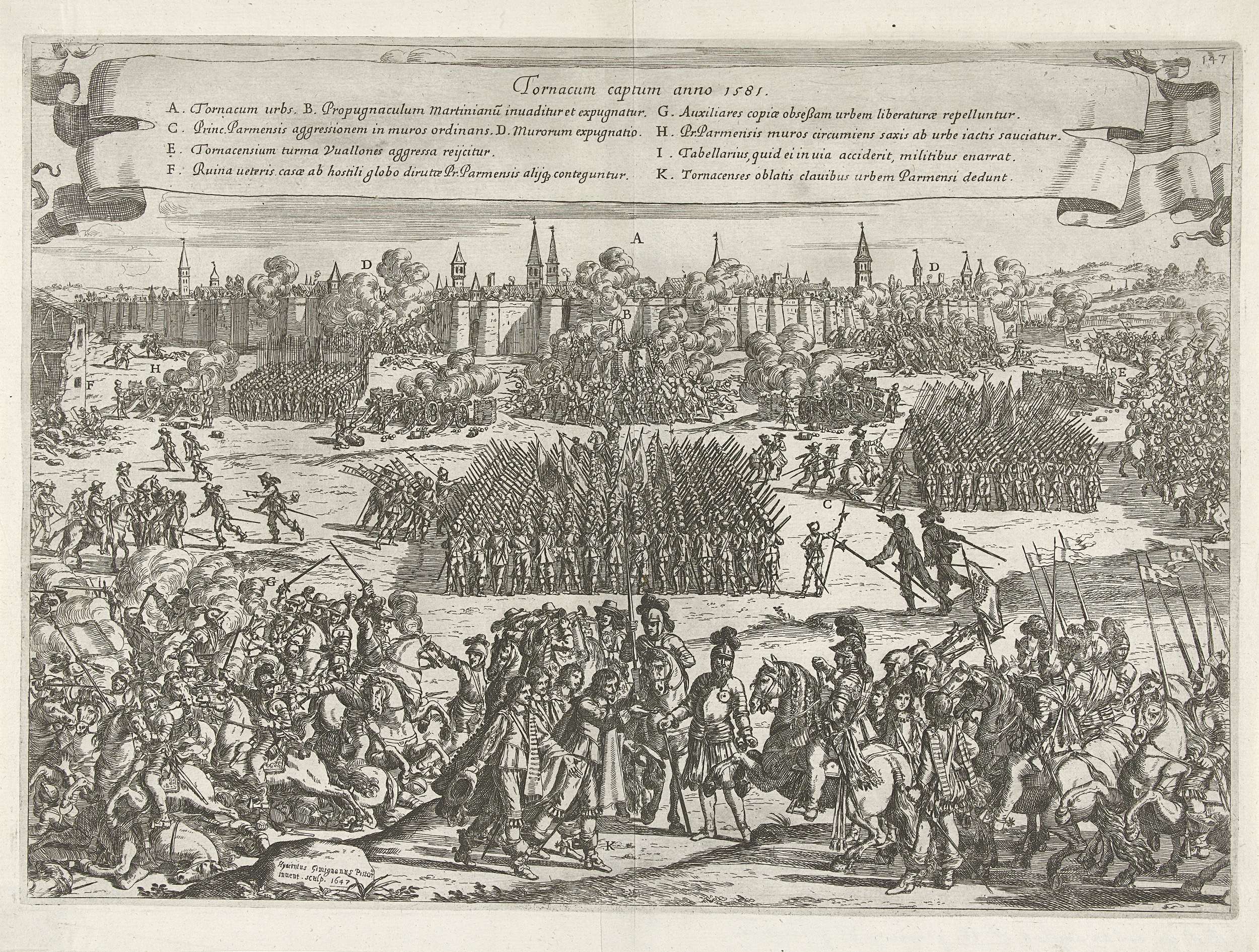 Verovering van Doornik door de hertog van Parma na een beleg van 1 oktober tot 29 november. Op de voorgrond een ruitergevecht en vertegenwoordigers van de stad die de sleutels van de stad overhandigen aan Parma. Op de achtergrond de belegering van de stad. Bovenaan een banderol met de legenda A-K in het Latijn.