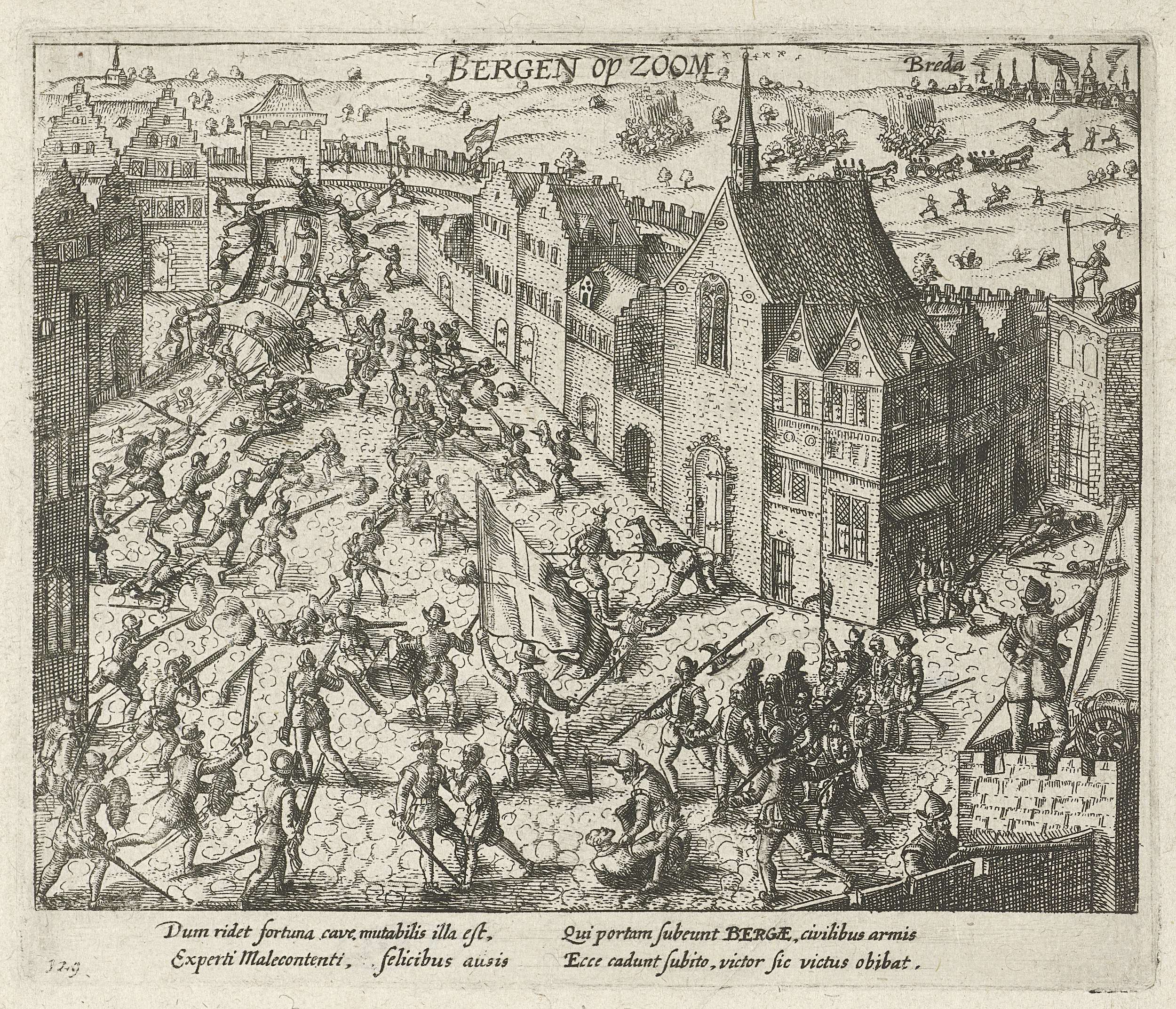 Aanslag op Bergen op Zoom verijdeld, 5 december 1581. De Waalse soldaten die via de Begijnenpoort de stad binnen waren gekomen in gevecht met het Franse garnizoen in de stad. Met onderschrift van 4 regels in het Latijn. Genummerd 129. Onbedrukt op achterzijde.