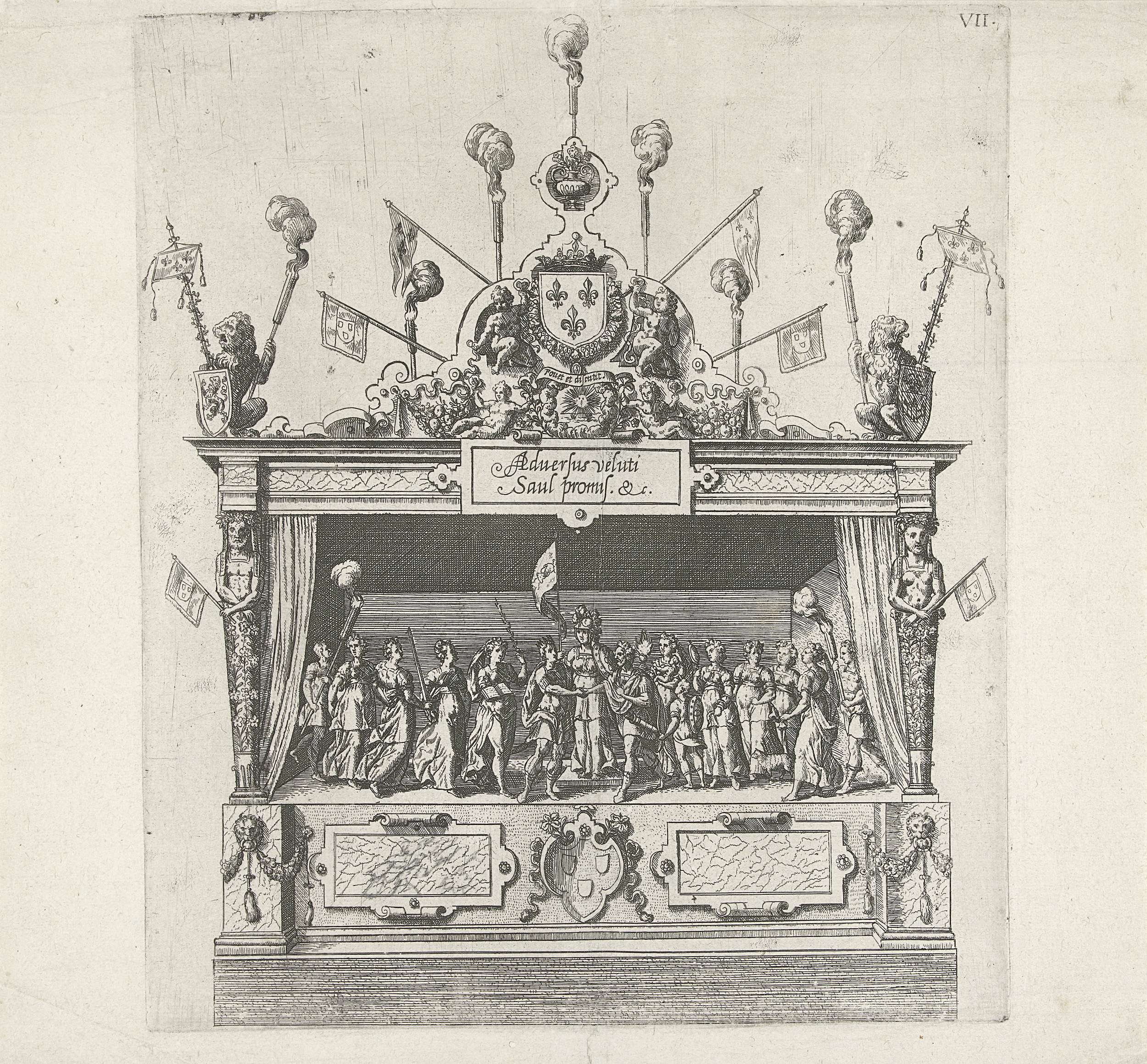 Het tweede toneel in de Drie Hoeken bij de Huidevetterstraat van de rederijkerskamer De Violieren met een voorstelling van het verbond tussen David en Jonathan, metafoor voor het verbond tussen Oranje en Anjou. Onderdeel van de beschrijving van de intocht van de hertog van Anjou te Antwerpen, 19 februari 1582.