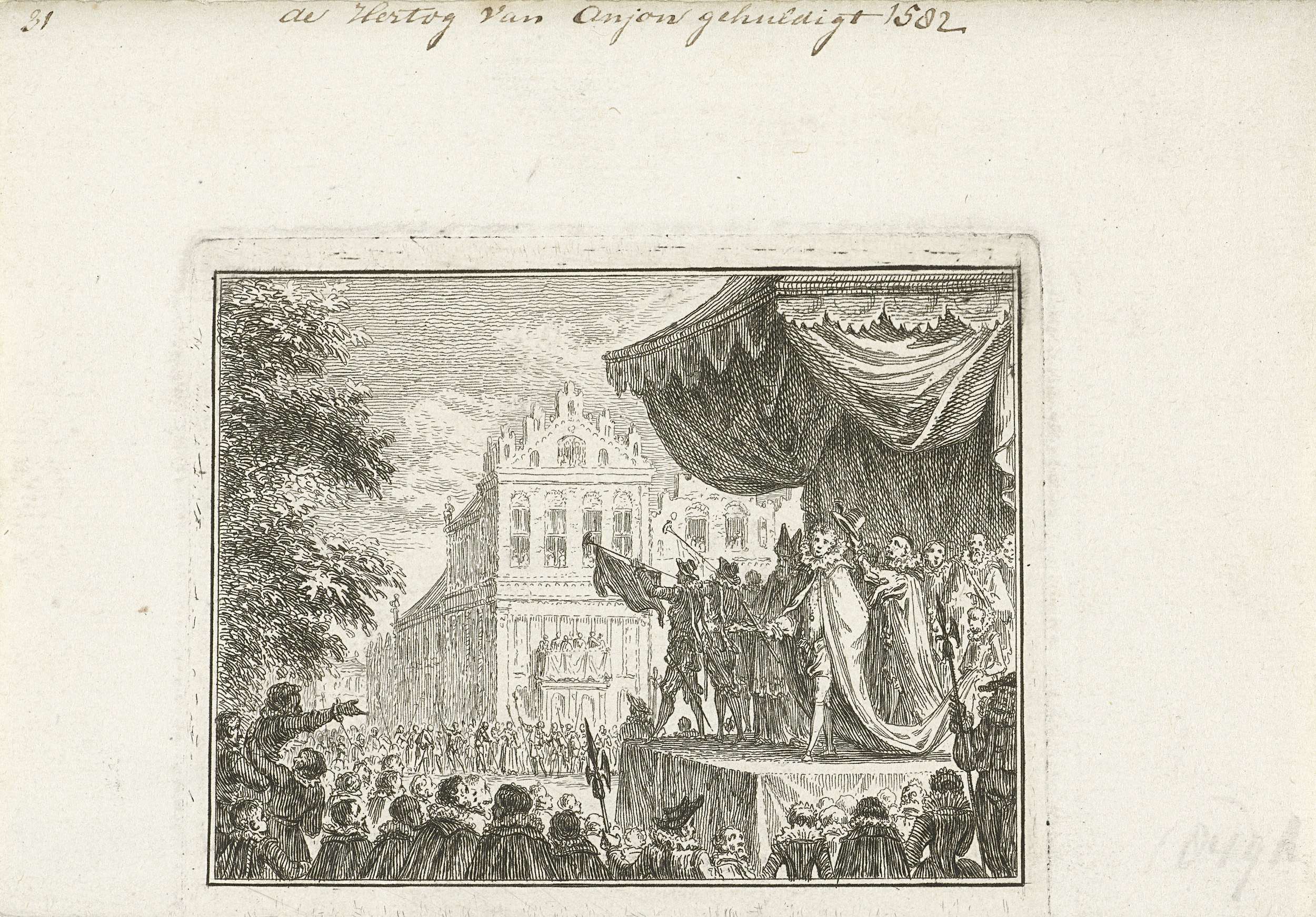 Huldiging van Anjou te Antwerpen, 19 februari 1582. Op een podium krijgt hij de mantel en hoed van de hertog van Brabant.