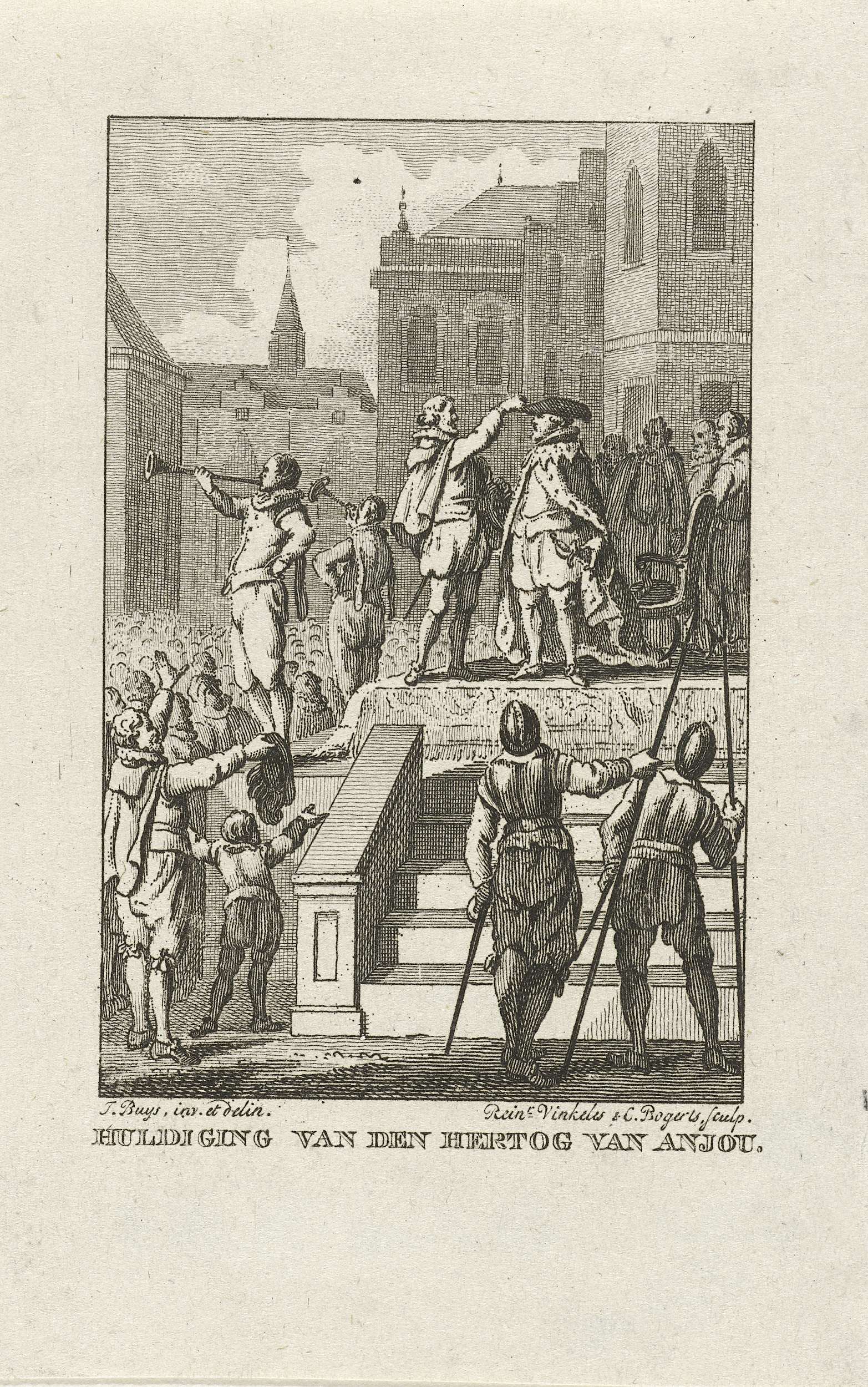Huldiging van Anjou te Antwerpen, 19 februari 1582. Op een podium krijgt hij de mantel en hoed van de hertog van Brabant.