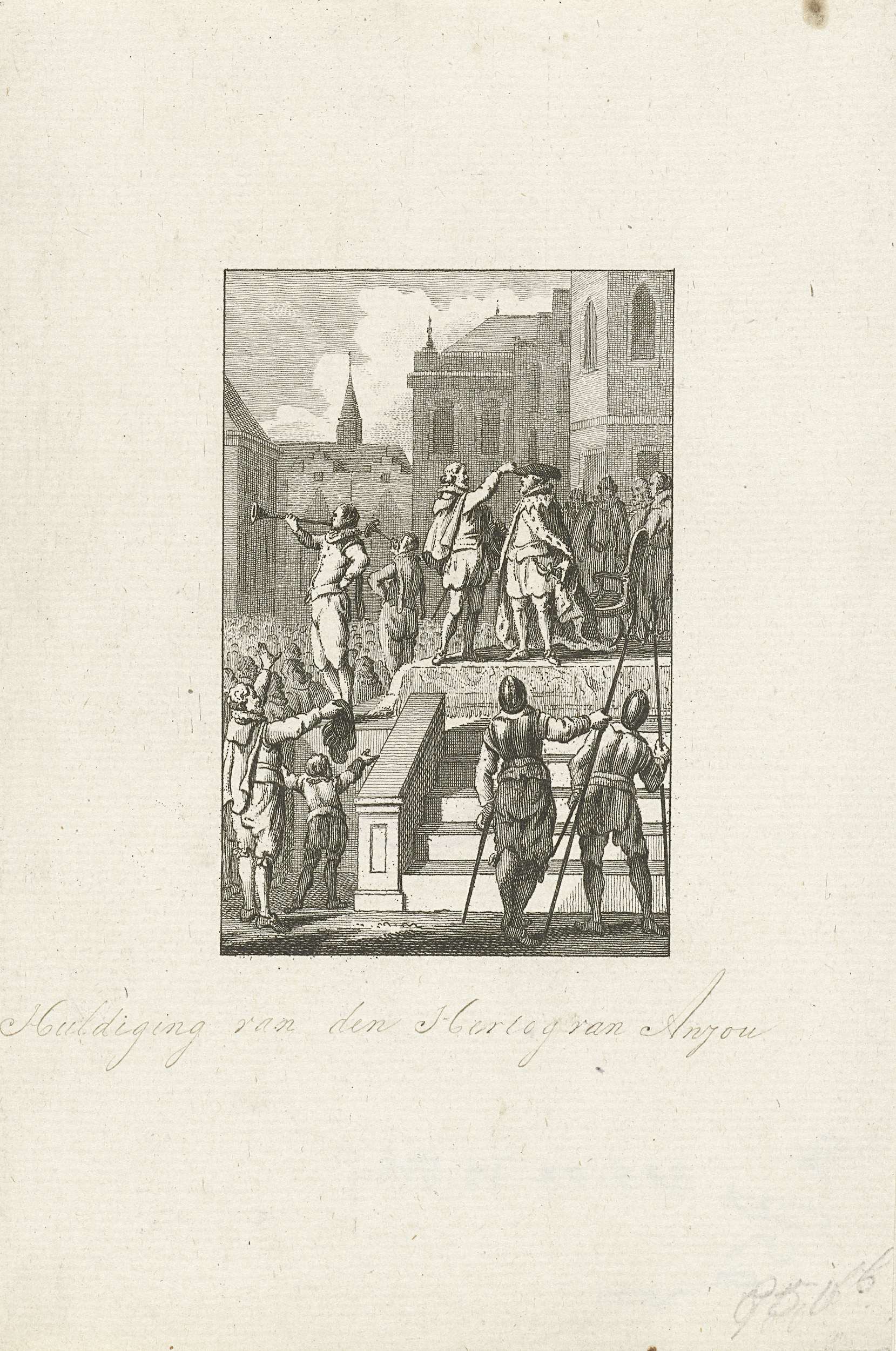 Huldiging van Anjou te Antwerpen, 19 februari 1582. Op een podium krijgt hij de mantel en hoed van de hertog van Brabant.