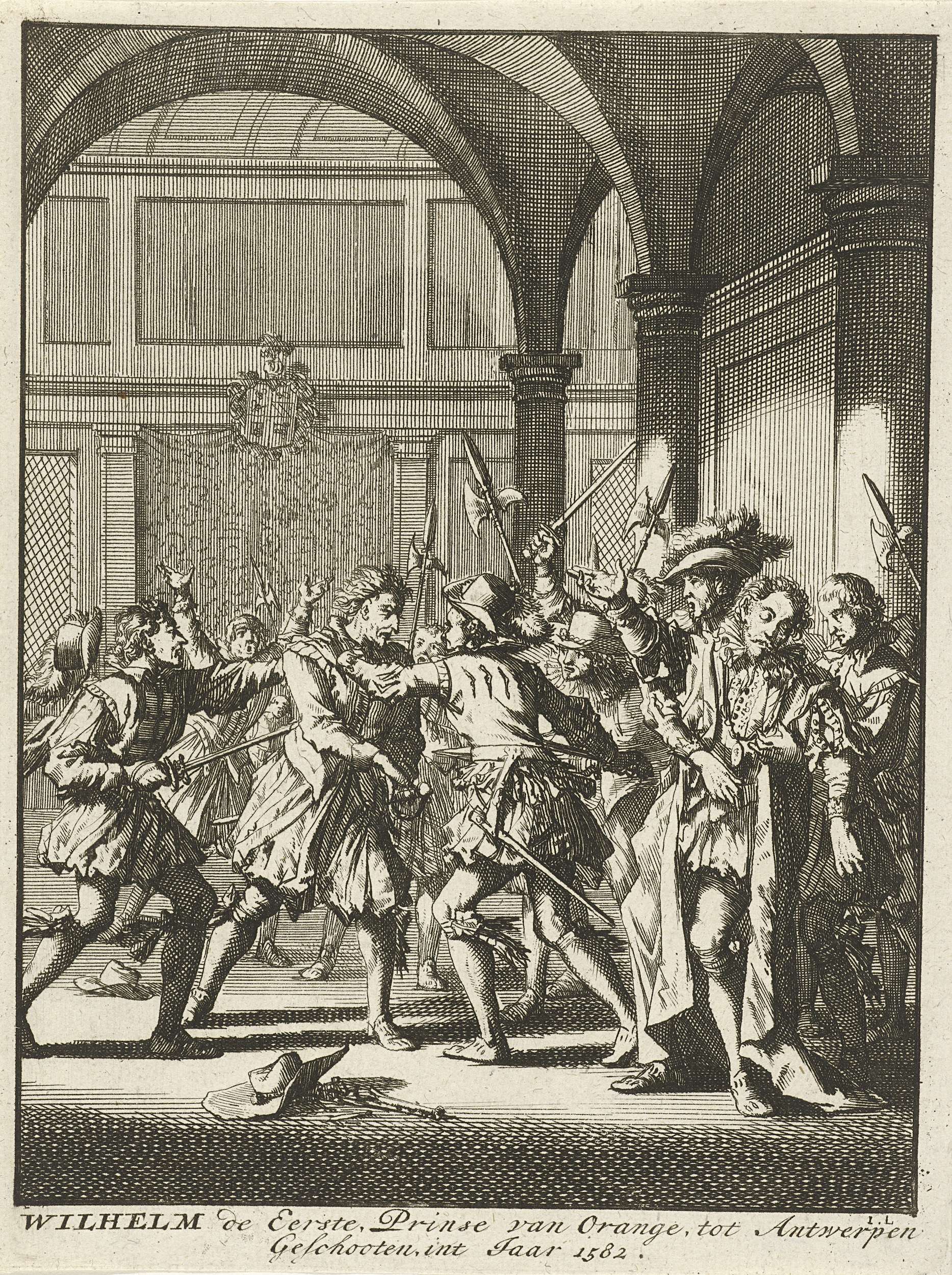 Moordaanslag door Jean de Jauregui op Willem van Oranje te Antwerpen, 18 maart 1582. Jauregui wordt door soldaten overmeesterd, rechts de gewonde prins.