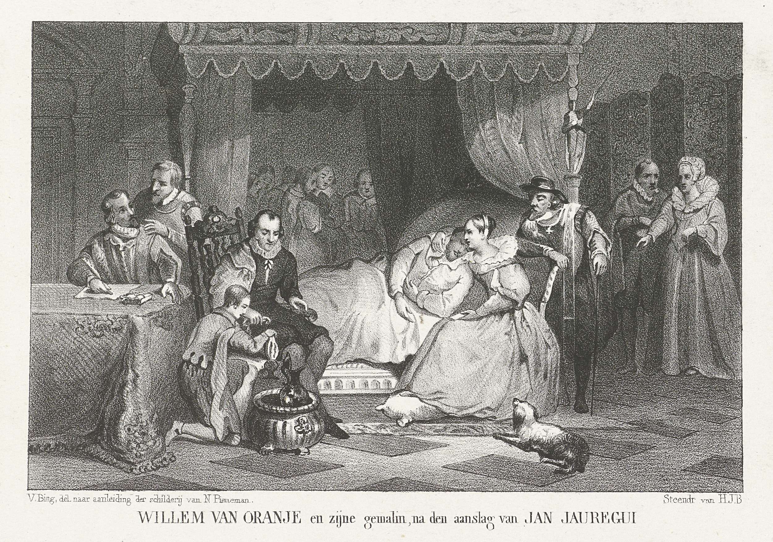 Prins Willem I herstellend van de aanslag door Jean de Jauregui, gepleegd op 18 maart 1582, te Antwerpen. De prins liggend in bed verzorgd door artsen en getroost door zijn vrouw Charlotte de Bourbon.
