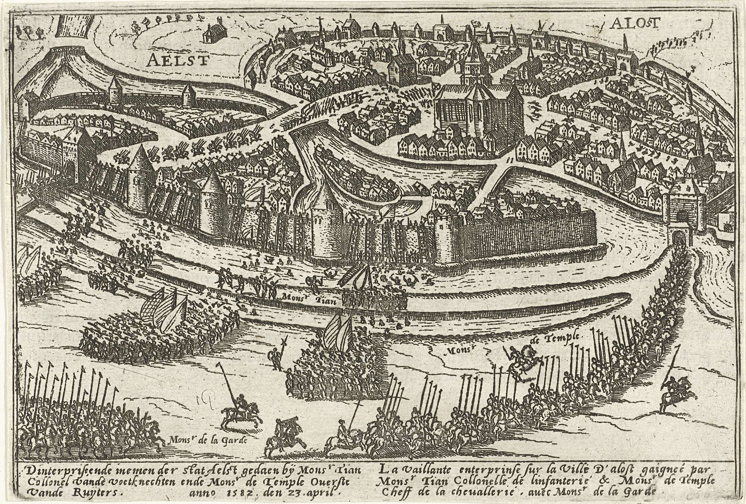 Inname van Aalst door het leger van de hertog van Parma, 23 april 1582. Met onderschrift van 3 regels in het Nederlands en 3 regels in het Frans. Ongenummerd. Bedrukt op achterzijde met tekst in het Latijn.