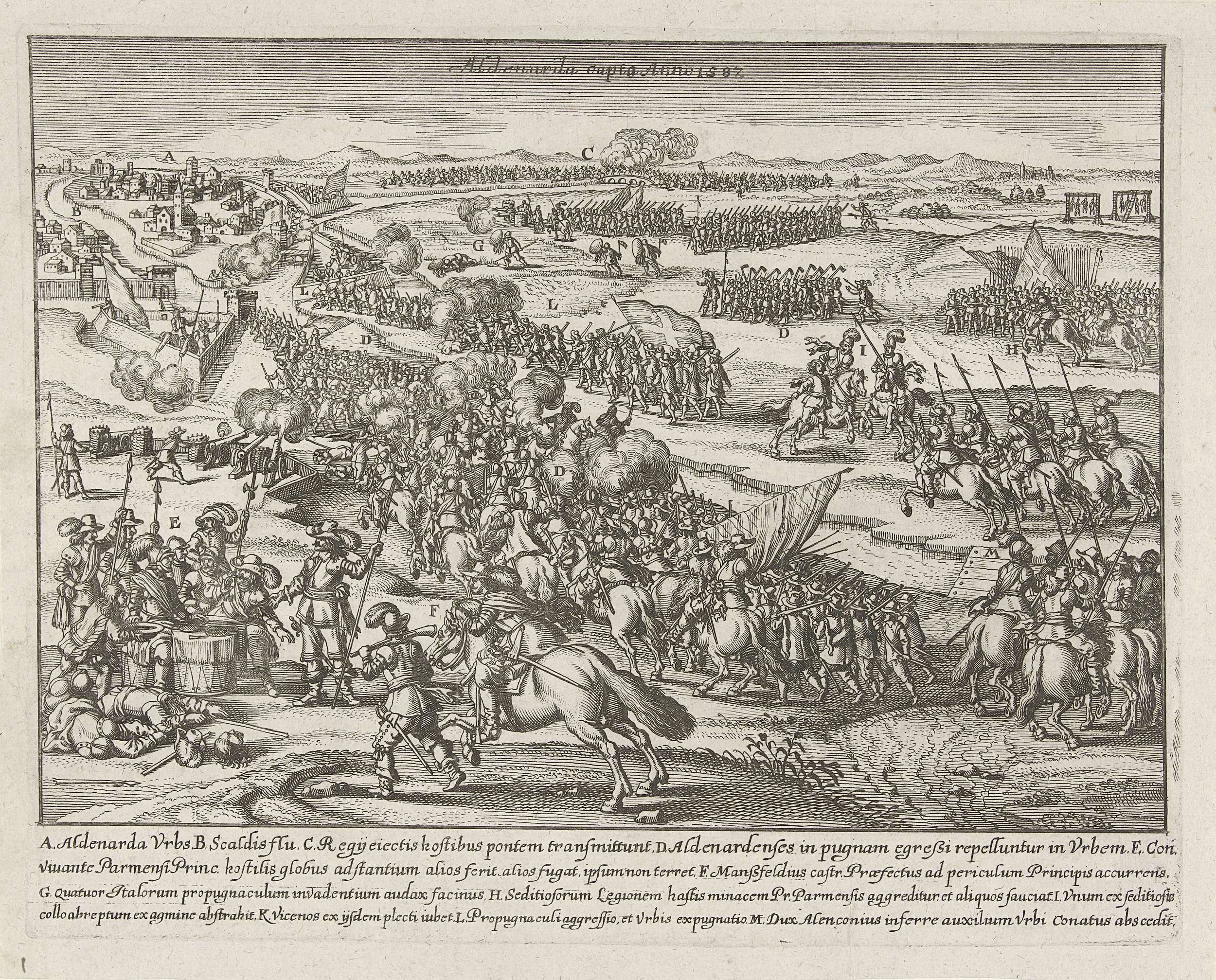 Beleg en inname van Oudenaarde, 5 juli 1582. Links ontsnapt de hertog van Parma wonderbaarlijk ongedeerd nadat een kanonschot zijn tafelgenoten doodt. In het onderschrift de legenda A-M in het Latijn.