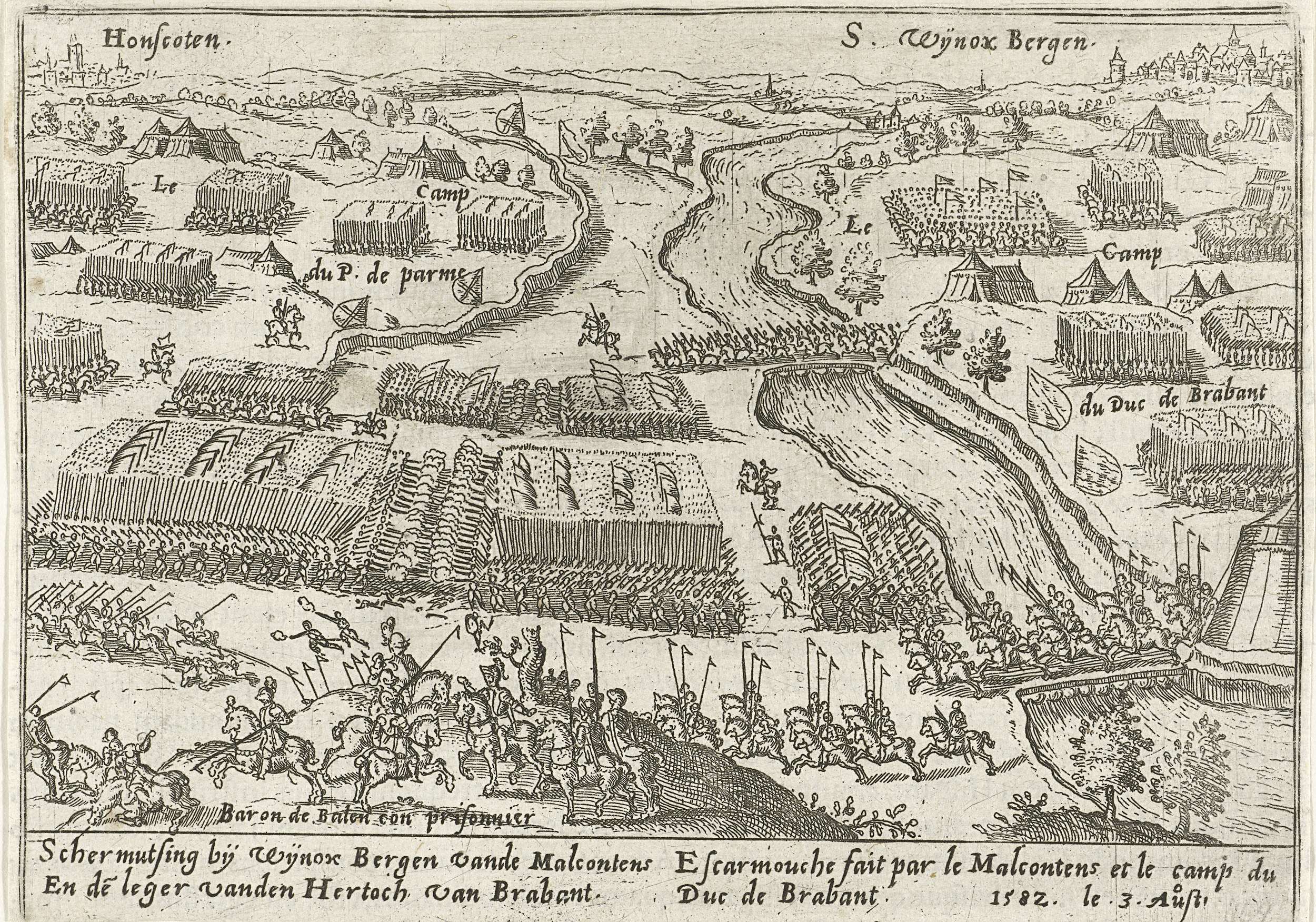 Schermutselingen tussen de legers van de hertog van Parma en de hertog van Anjou bij Sint-Winoksbergen (Wijnoxbergen), 3 augustus 1582. Met onderschrift van 2 regels in het Nederlands en 2 regels in het Frans. Ongenummerd. Bedrukt op achterzijde met tekst in het Latijn.