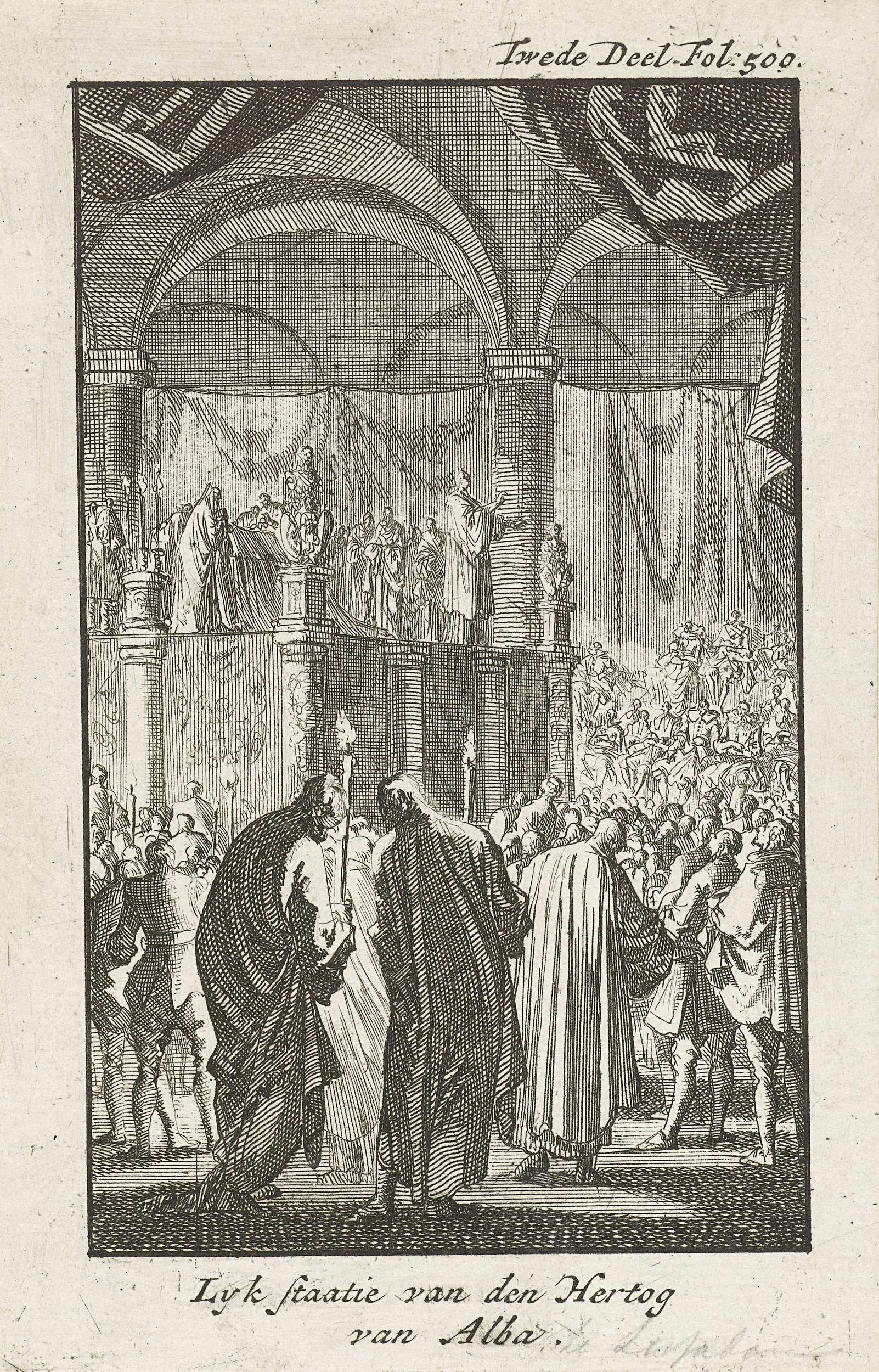 Lijkstatie van de hertog van Alva, 12 december 1582. Op een verhoging in een kerk ligt de kist, een man houdt een toespraak voor de menigte, op de voorgrond twee mannen met kaarsen.