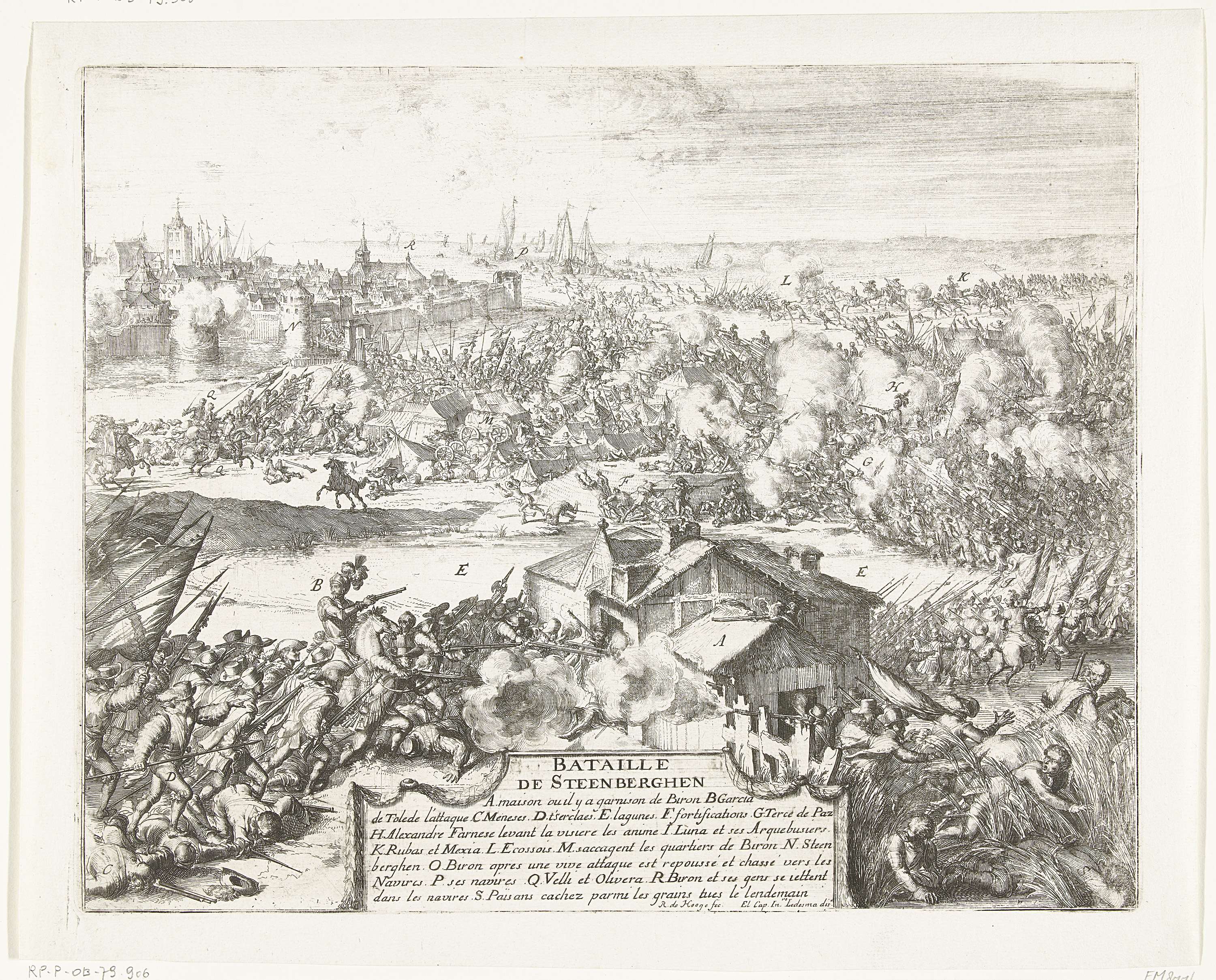 Slag in de buurt van Steenbergen en Halteren, bij Bergen op Zoom, 17 juni 1583. Middenonder een cartouche met de titel en de legenda A-S in het Frans.