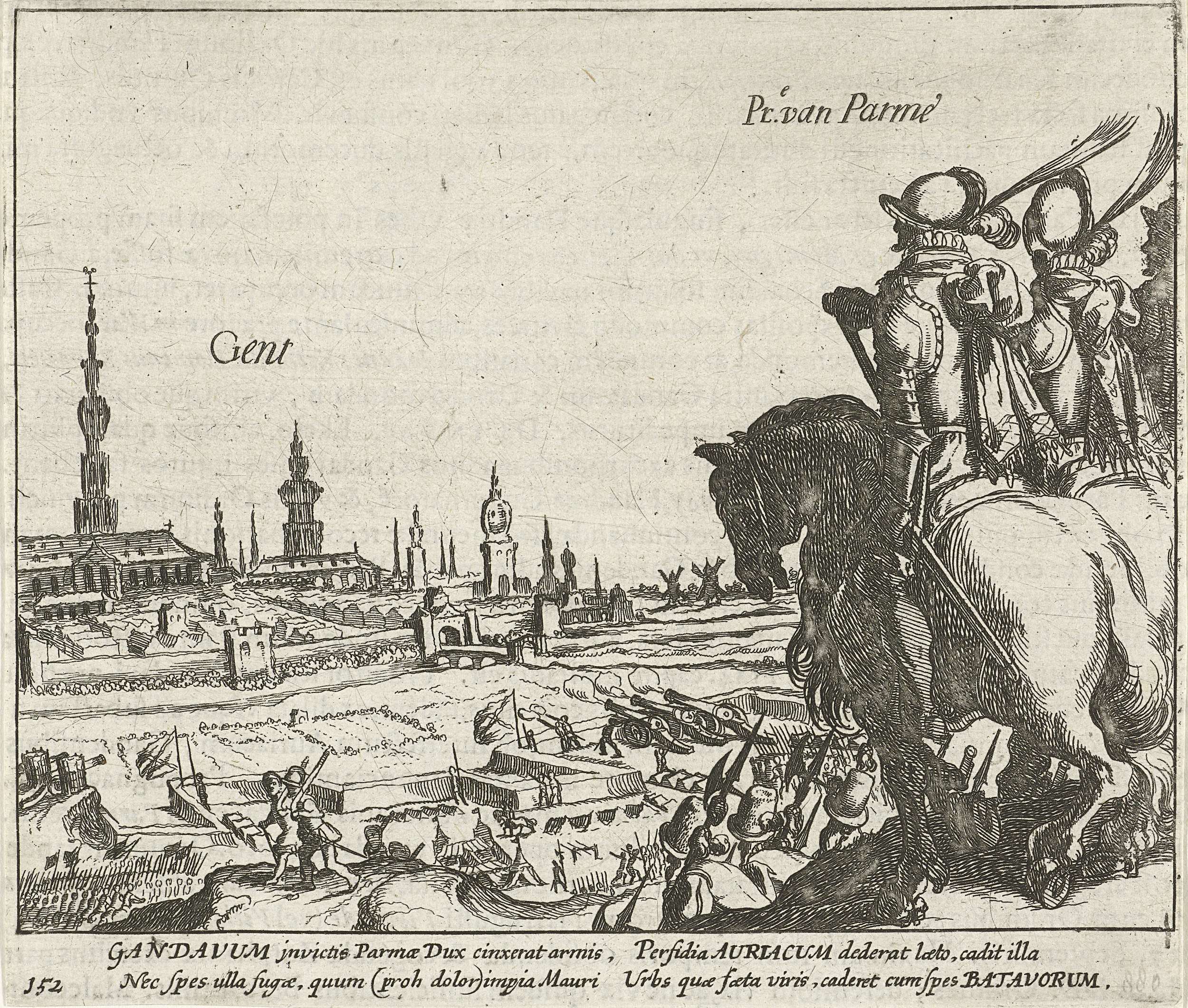 Beleg van Gent door het leger van Parma. Gezicht vanuit de stellingen van de belegeraars op de stad, op de voorgrond de hertog van Parma met enkele ruiters te paard, 1583 tot 17 september 1584. Met onderschrift van 4 regels in het Latijn. Genummerd 152. Bedrukt op achterzijde met tekst in het Latijn.