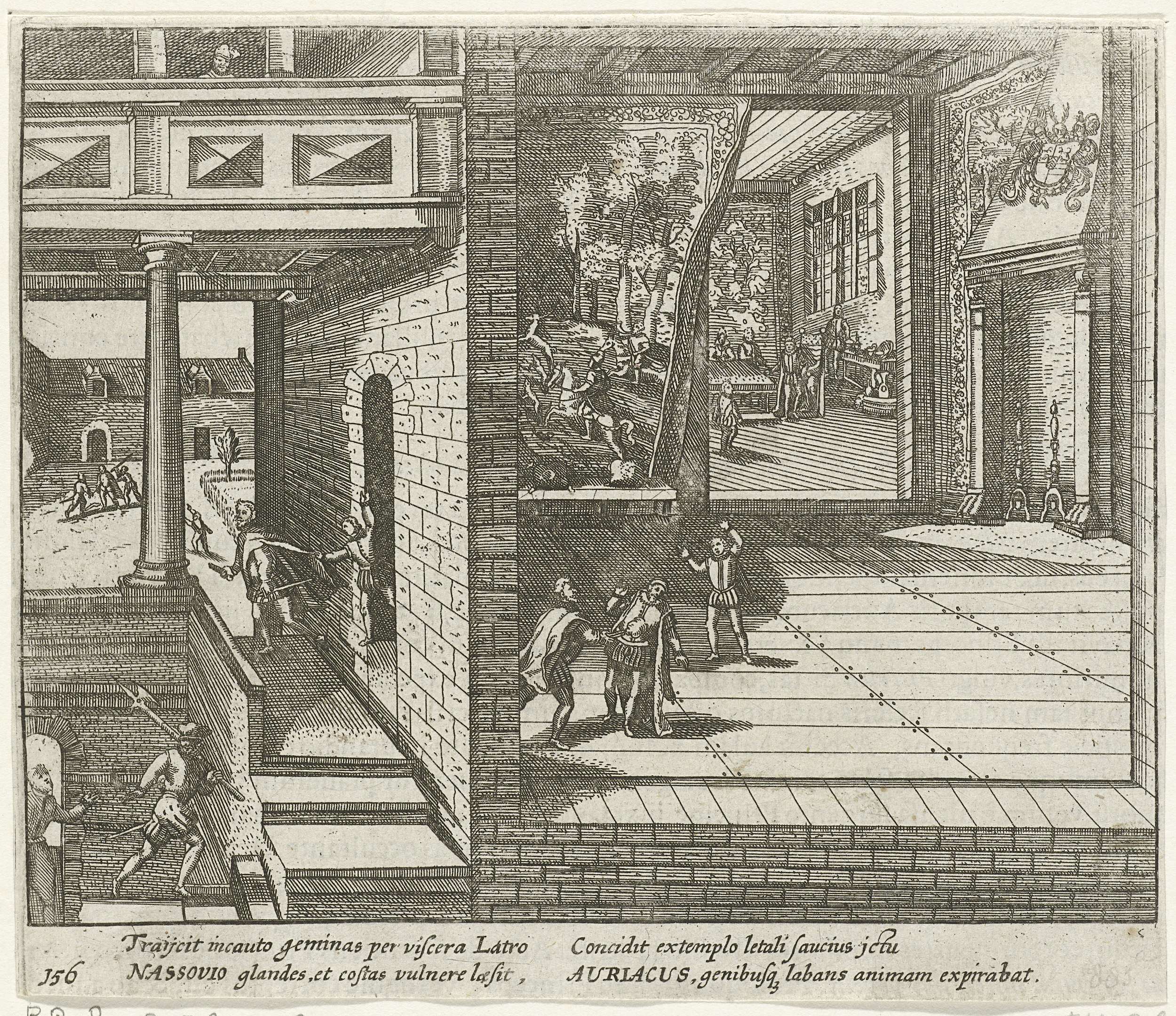 Willem van Oranje vermoord door Balthasar Gerards, 10 juli 1584. Gezicht op interieur Prinsenhof: achter ontvangt de prins Gerards in een kamer, op de voorgrond wordt de prins neergeschoten. Links probeert Gerard te ontsnappen en wordt hij gevangengenomen. Met onderschrift van 4 regels in het Latijn. Genummerd 156. Bedrukt op achterzijde met tekst in het ...