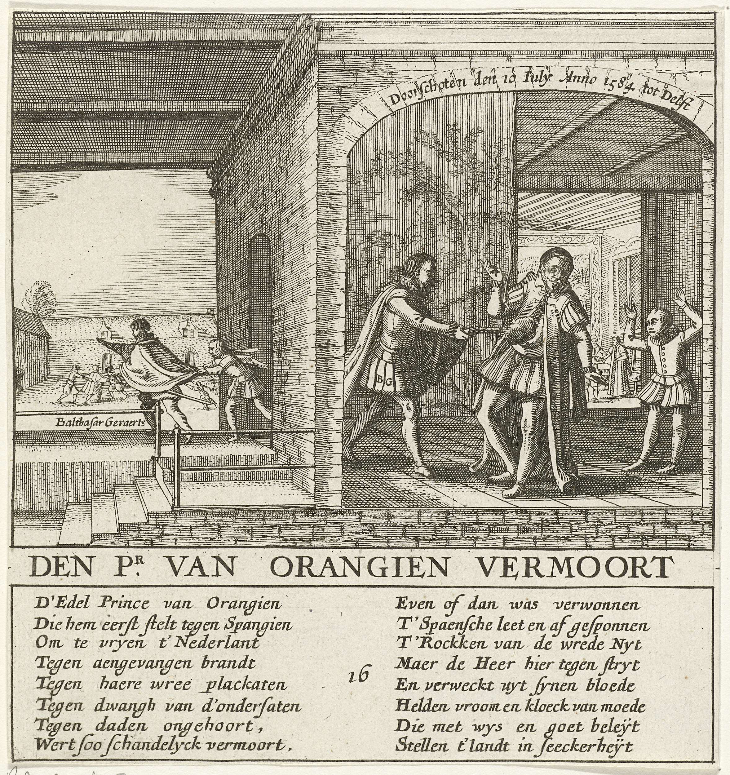 De prins van Oranje te Delft vermoord door Balthasar Gerards, 10 juli 1584. Op de voorgrond wordt de prins neergeschoten, op de achtergrond wordt de moordenaar aangehouden. Onder de voorstelling een vers van 16 regels in 2 kolommen in het Nederlands. Genummerd: 16.