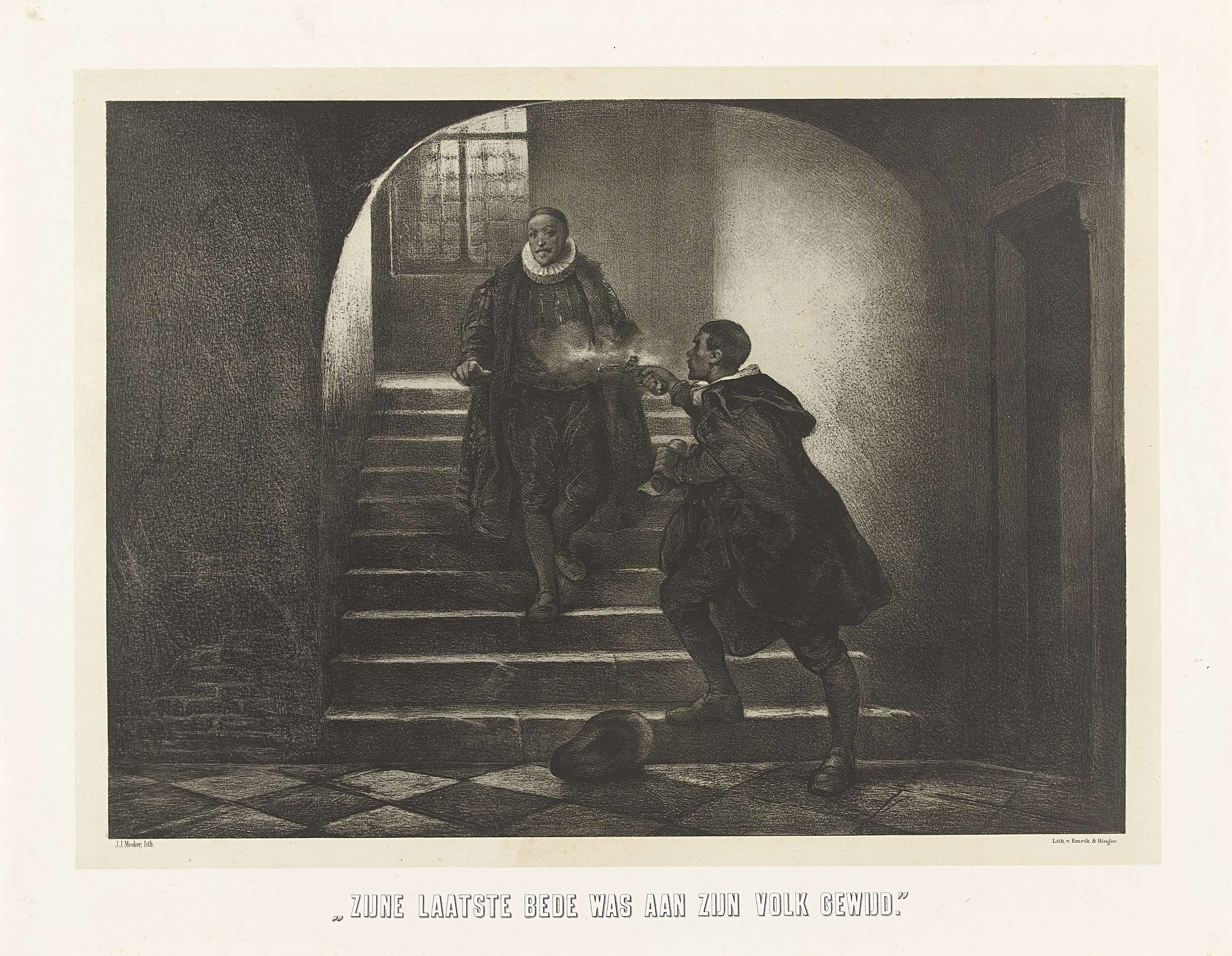De prins van Oranje te Delft vermoord door Balthasar Gerards, 10 juli 1584. De prins wordt op de trap neergeschoten door Balthasar Gerards.