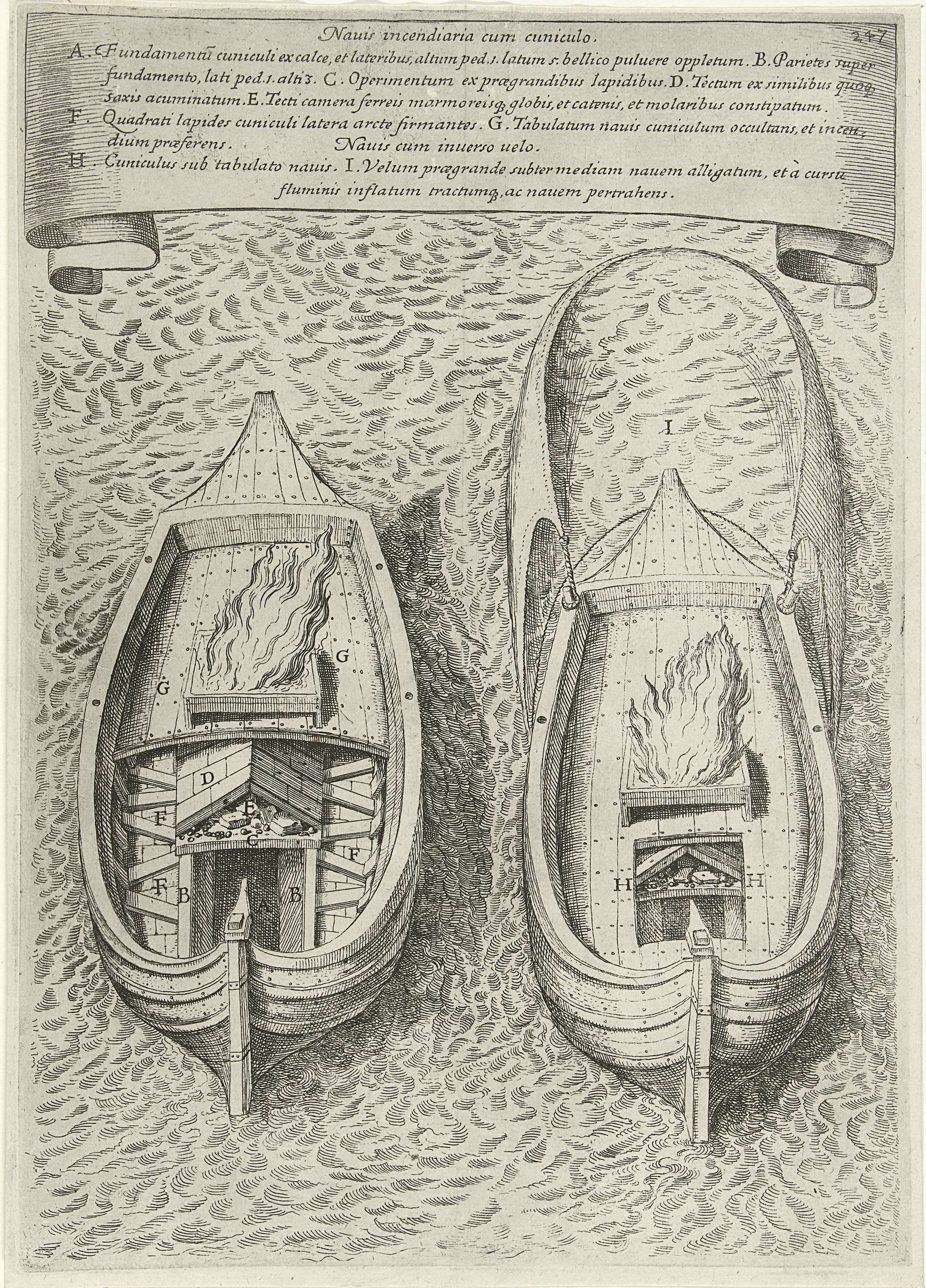 Twee voorstellingen van branders gebruikt bij de aanvallen op de schipbrug aangelegd door de hertog van Parma in de Schelde tijdens het beleg van Antwerpen in 1585. Bovenaan in een banderol de titel en legenda A-I in het Latijn.