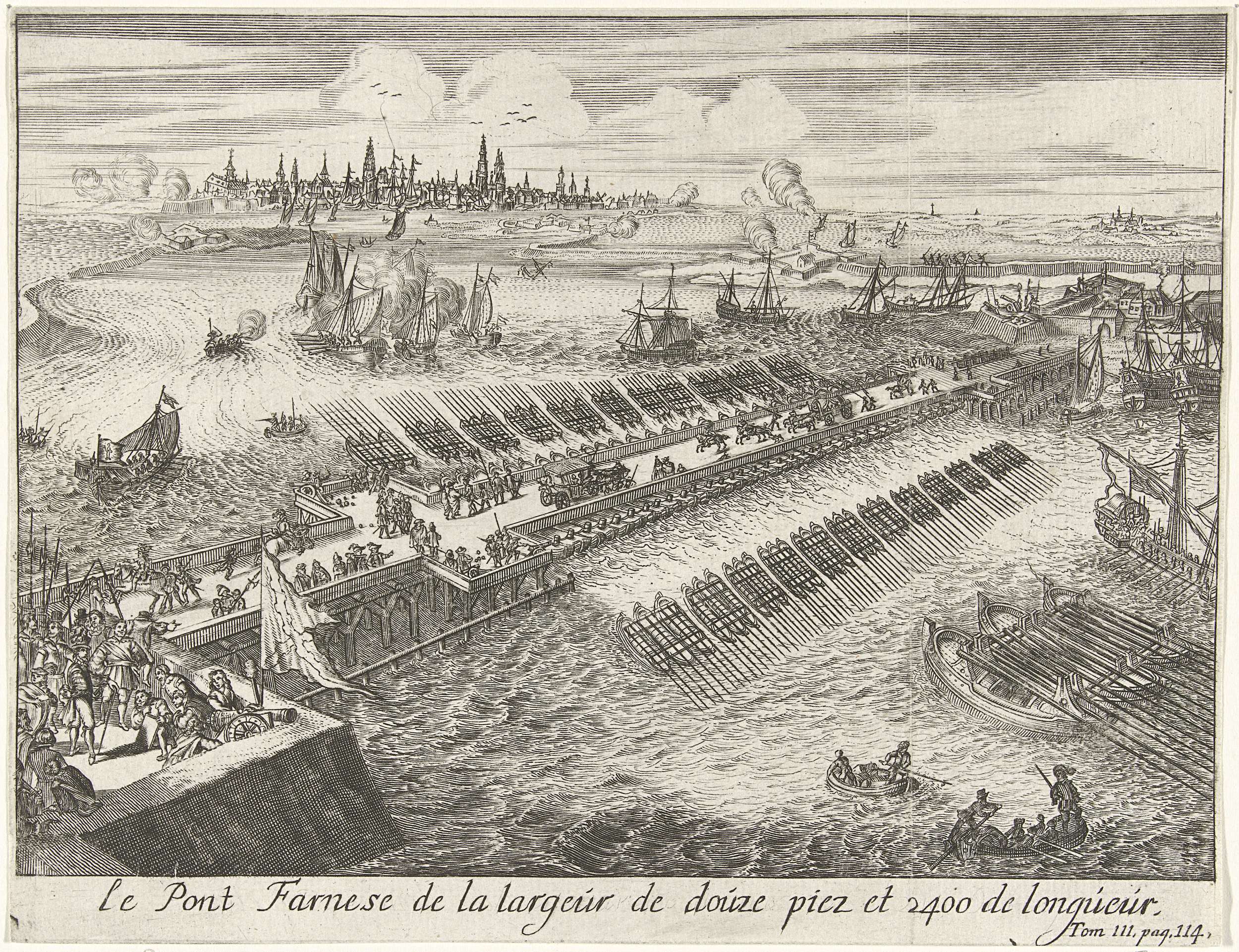 De schipbrug aangelegd door de hertog van Parma over de Schelde, 1585. Linksvoor keurt Farnese het ontwerp voor de schipbrug goed. In de verte de stad Antwerpen. Rijtuigen en soldaten gaan over de voltooide brug.