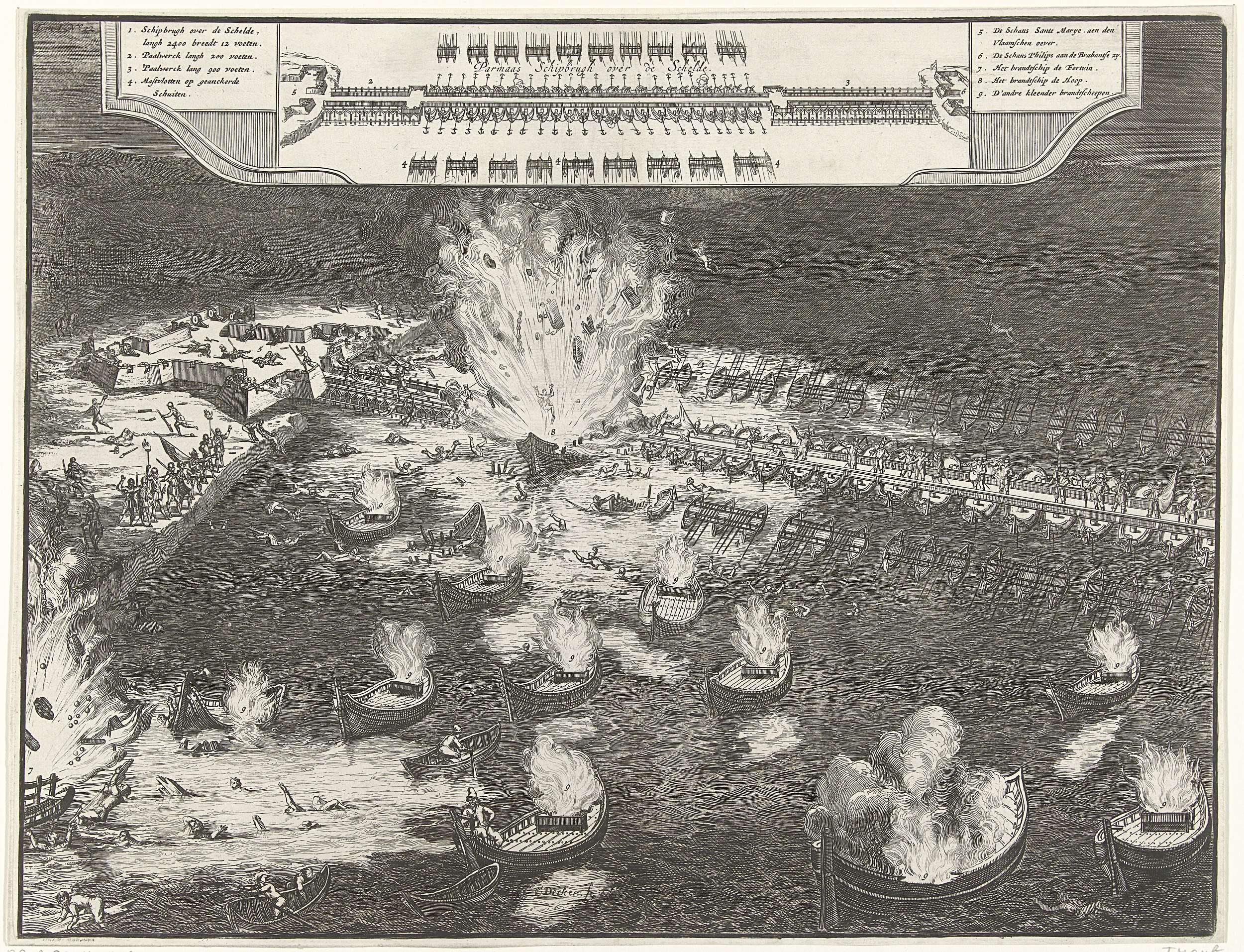 Het opblazen met branders van de schipbrug aangelegd door de hertog van Parma in de Schelde vóór Antwerpen, 5 april 1585. Bovenaan een inzet met de brug intact en een legenda 1-9 in het Nederlands.