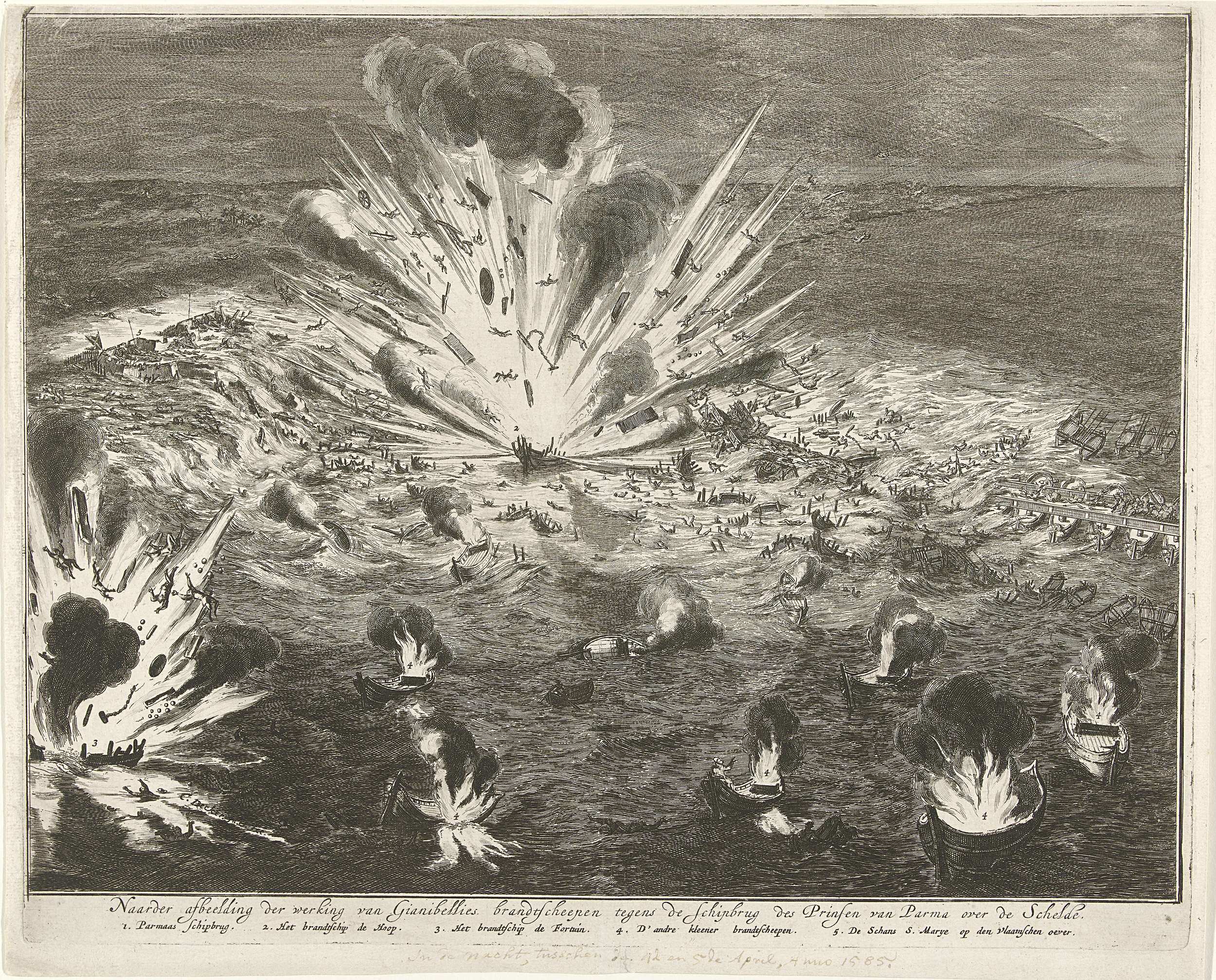 Het opblazen met branders van de schipbrug aangelegd door de hertog van Parma in de Schelde vóór Antwerpen, in de nacht van 4 op 5 april 1585. In het onderschrift de titel en een legenda 1-5 in het Nederlands.