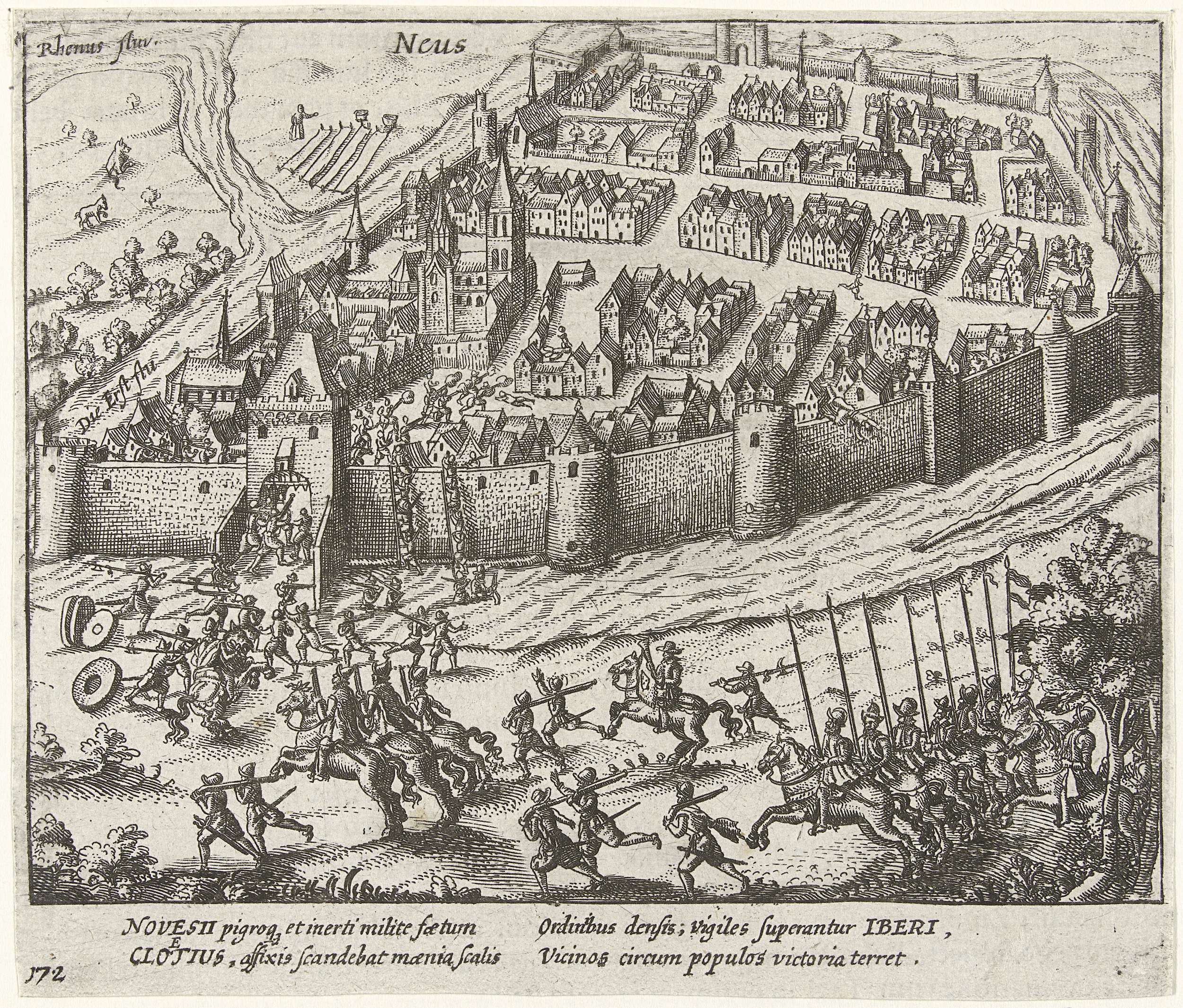 Inname van Neuss, 11 mei 1585. Met onderschrift van 4 regels in het Latijn. Genummerd 172. Bedrukt op achterzijde met tekst in het Latijn.