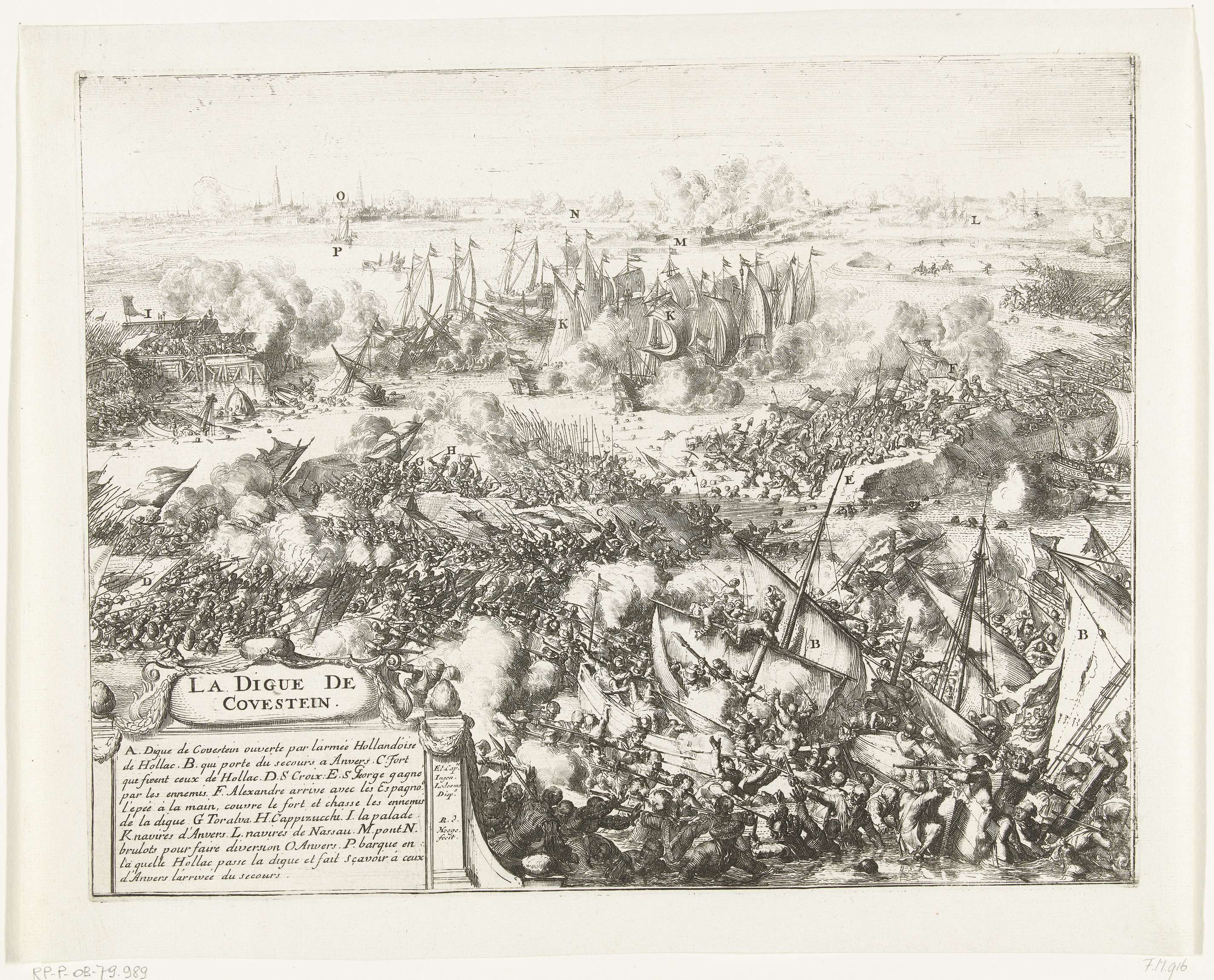 Slag op de Kauwensteinse dijk, 26 mei 1585. Veldslag rond de deels doorgestoken dijk, met vele zeilbootjes. Linksonder een cartouche met de titel en de legenda A-P in het Frans.
