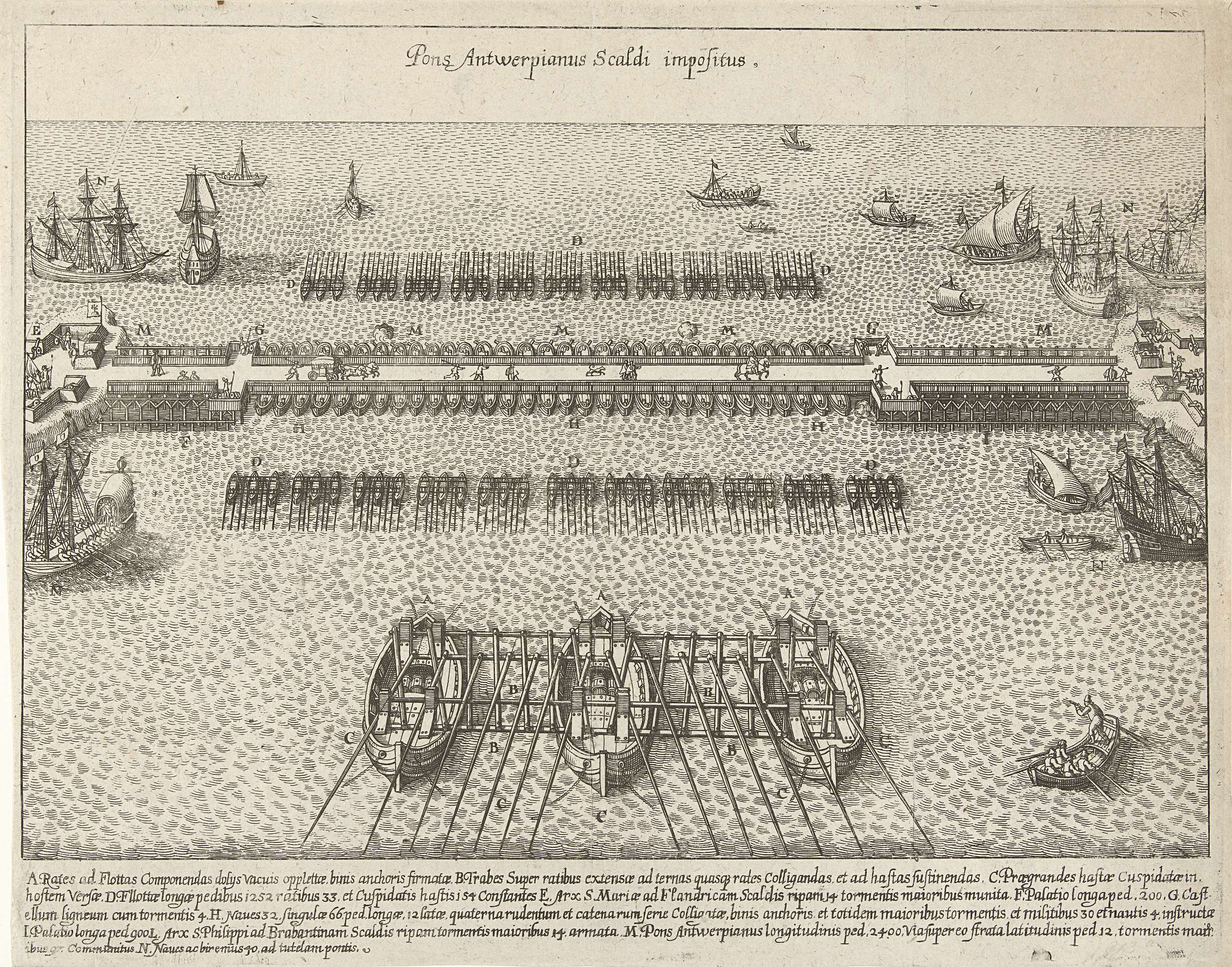 De schipbrug aangelegd door de hertog van Parma in de Schelde vóór Antwerpen, 1585. In het onderschrift de legenda A-N in het Latijn.