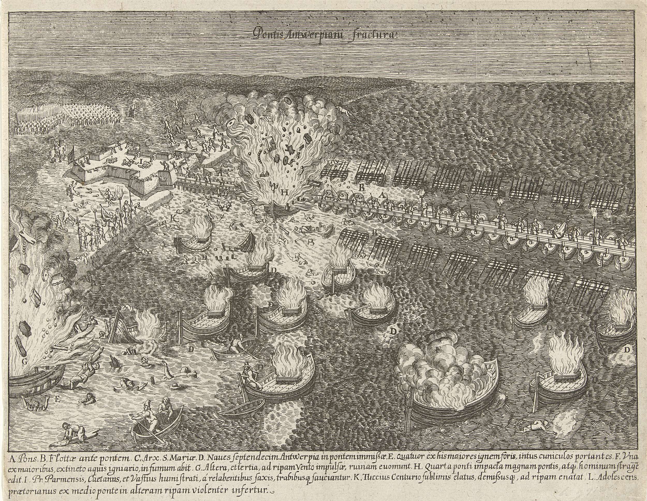 Het opblazen door middel van branders van de schipbrug aangelegd door de hertog van Parma in de Schelde vóór Antwerpen, 1585. In het onderschrift de legenda A-N in het Latijn.