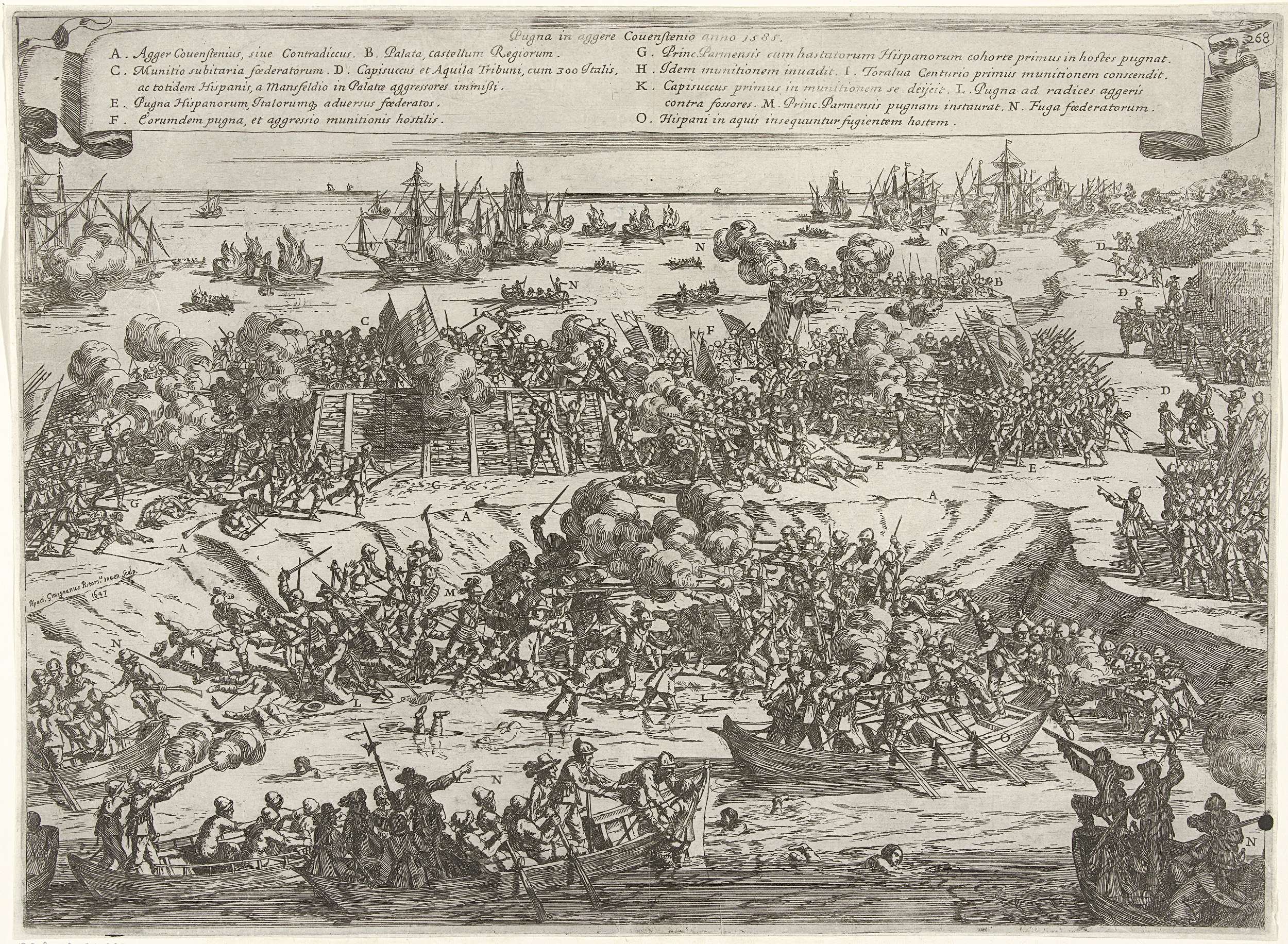 Slag op de Kauwensteinse dijk, 26 mei 1585. Veldslag rond de deels doorgestoken dijk. Bovenin een banderol met de titel en legenda A-O in het Latijn.