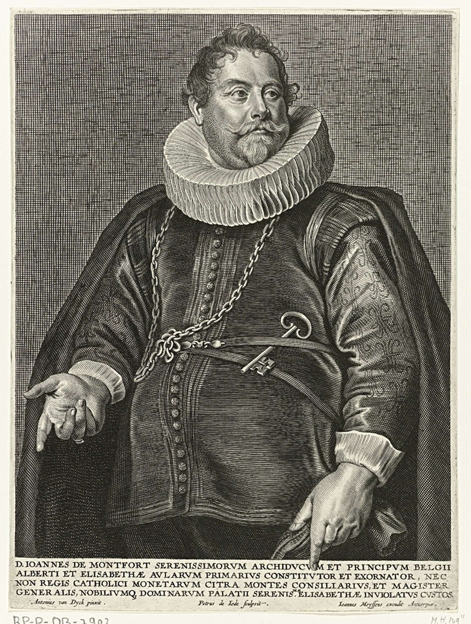 Portret van Jan van Montfort, ten halven lijve. Hij draagt een sleutel in zijn bandelier. In de marge een vierregelig onderschrift in het Latijn.