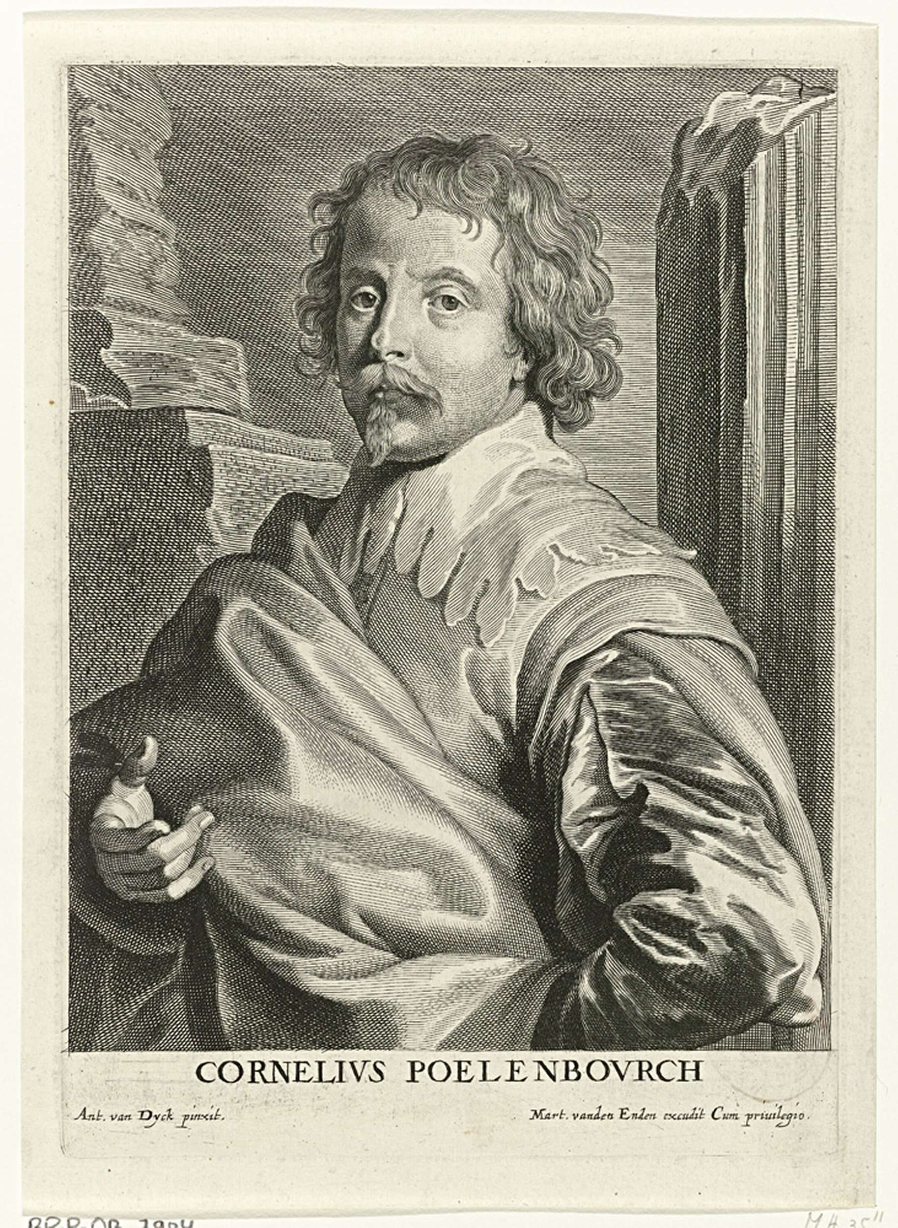Portret van Cornelis van Poelenburgh, ten halven lijve. Hij staat tussen ruïnes. In de marge de naam van de geportretteerde.