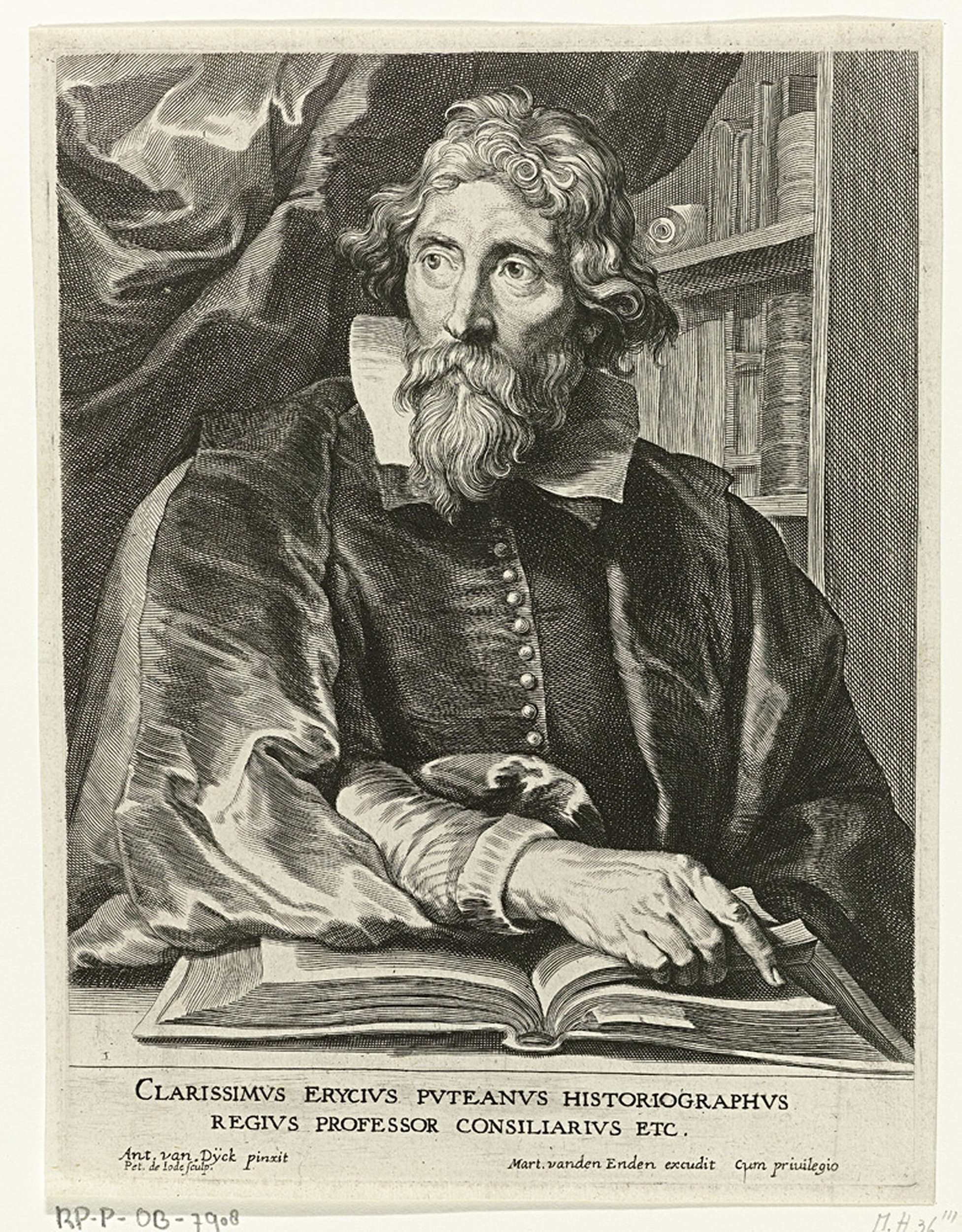 Portret van Erycius Puteanus, ten halven lijve. Hij zit aan een bureau en slaat met zijn rechterhand de bladzijden van een boek om. Op de achtergrond een boekenkast. In de marge een tweeregelig onderschrift in het Latijn.