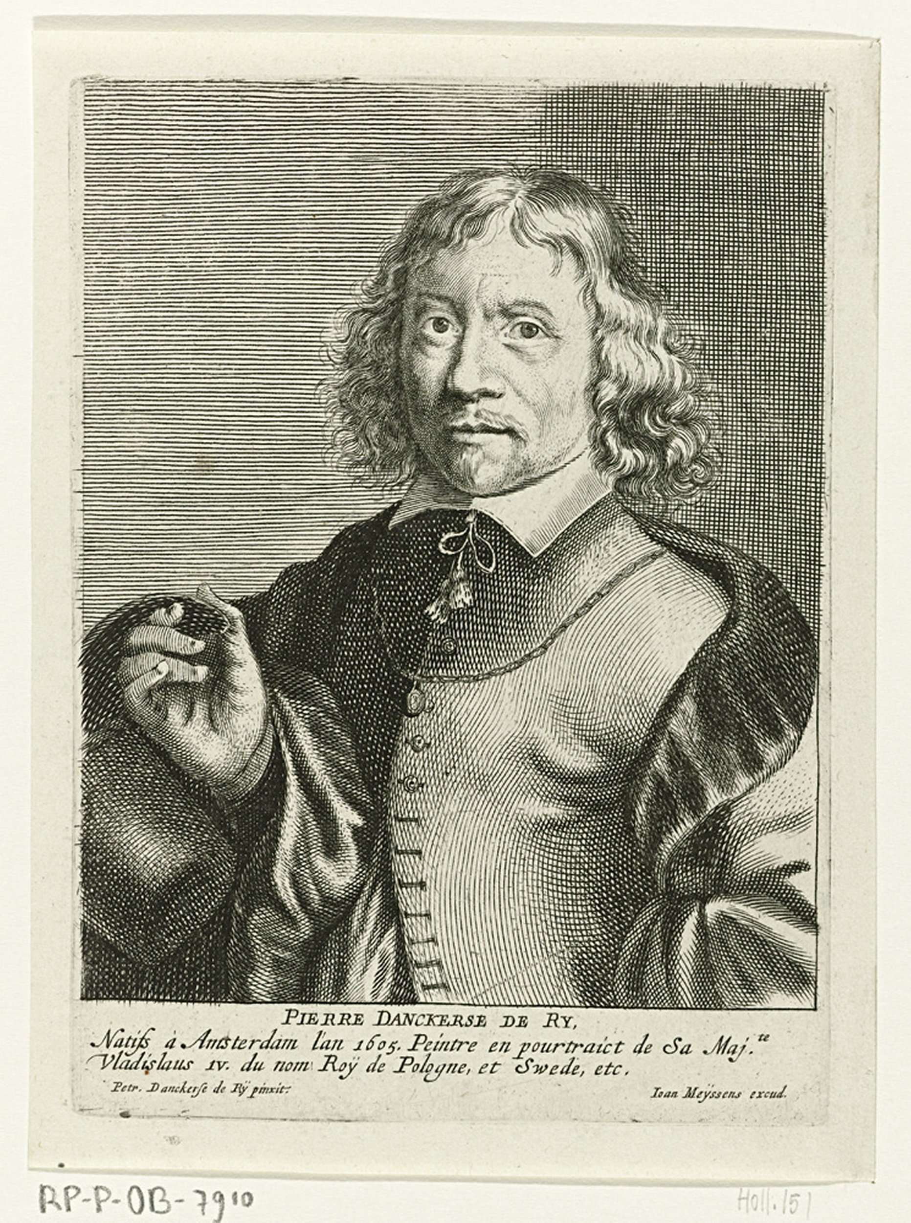 Portret van Pieter Danckerts de Rij, ten halven lijve. In de marge de naam van de geportretteerde en een tweeregelig onderschrift in het Frans.