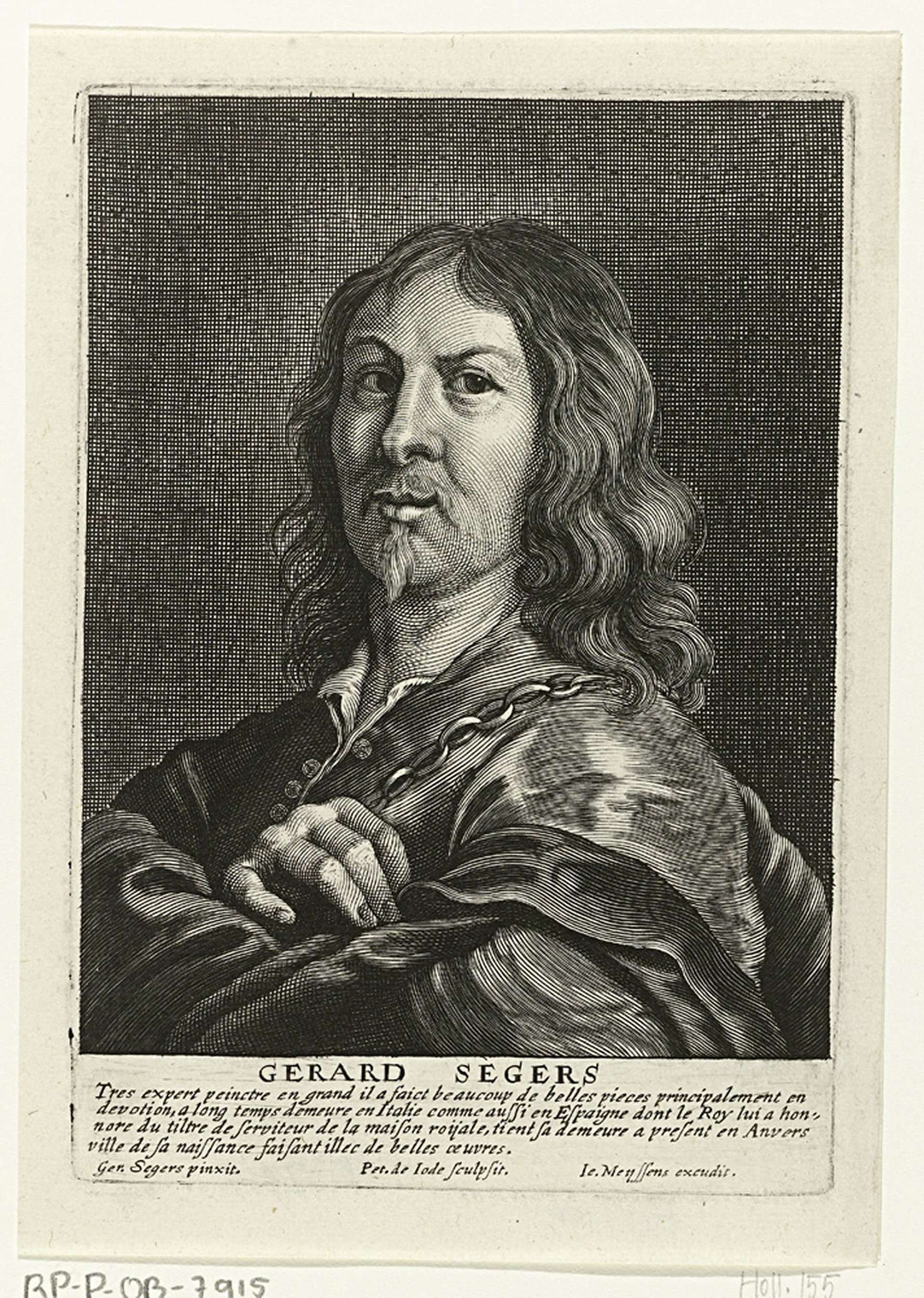 Busteportret van Gerard Seghers. Hij draagt een keten om zijn hals en heeft zijn armen over elkaar geslagen. In de marge de naam van de geportretteerde en een vierregelig onderschrift in het Frans.