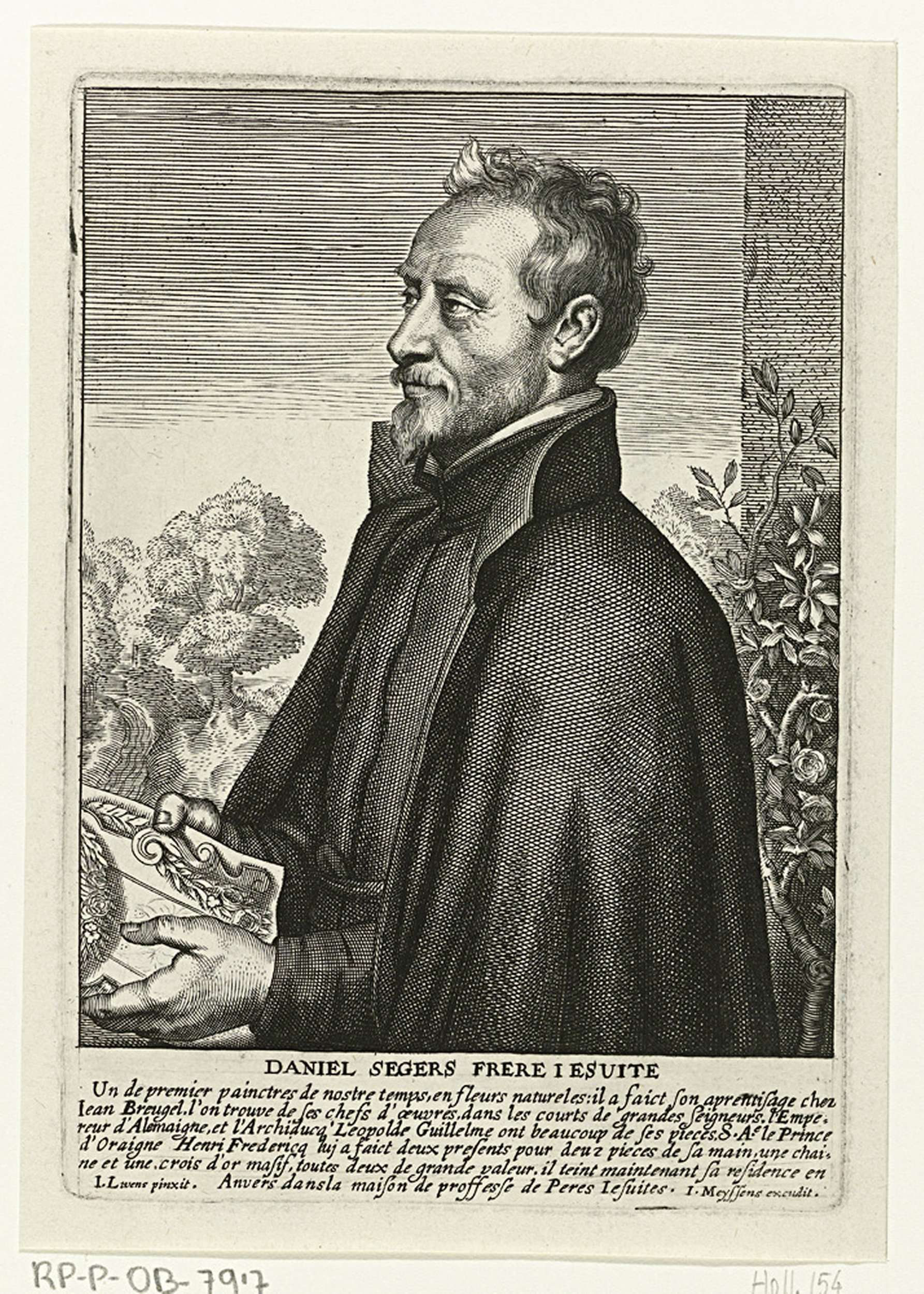 Portret van Daniël Seghers, ten halven lijve. In zijn handen houdt hij een prent. Achter hem een rozenstruik. Op de achtergrond een met bomen omzoomd pad. In de marge de naam van de geportretteerde en een zesregelig onderschrift in het Frans.