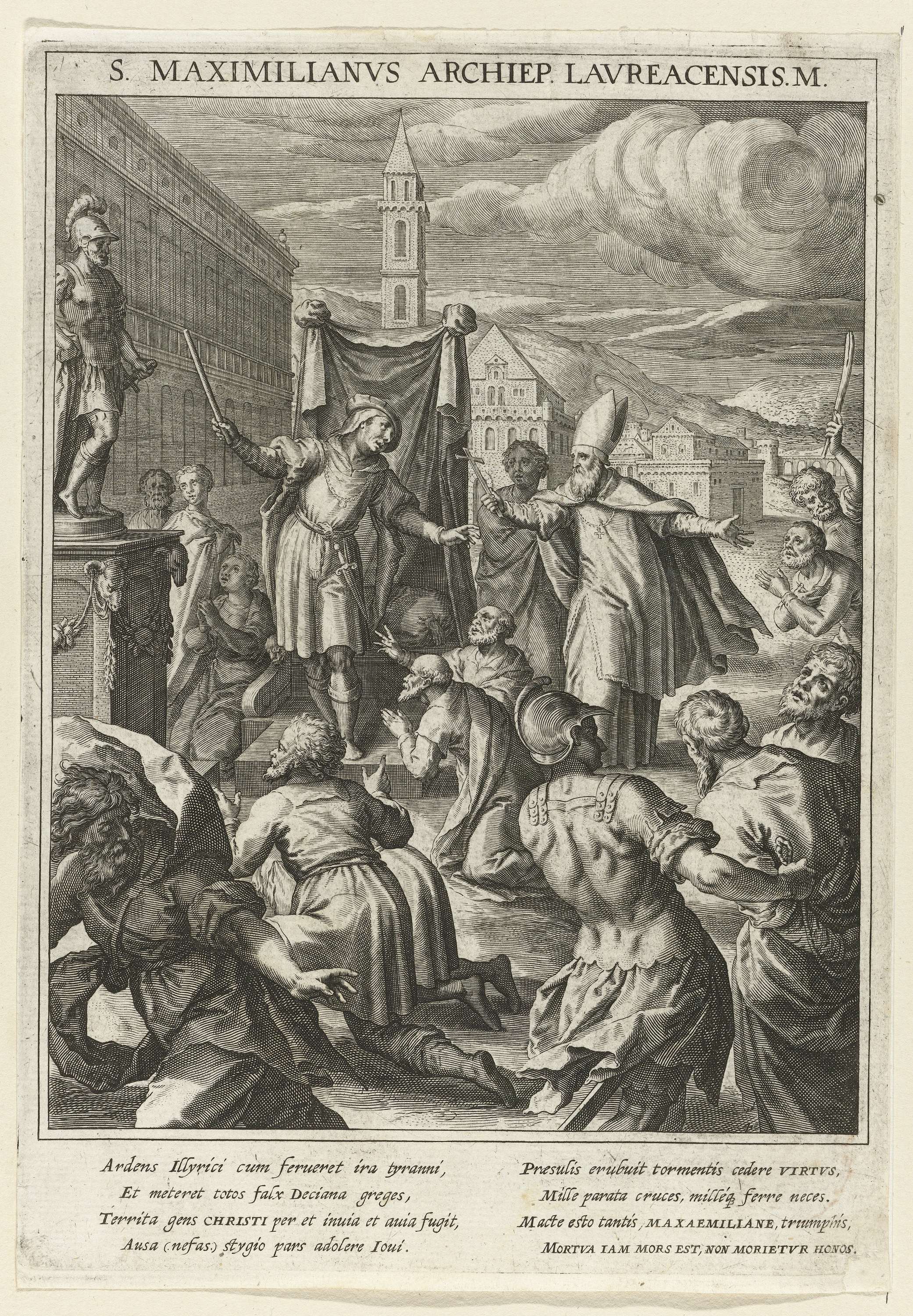 De H. Maximilianus, de bisschop van Lorch, weigert te offeren bij het standbeeld van de oorlogsgod Mars. Rondom hem andere gevangen Christenen. Rechts een man met een kapmes, een voorbode van het martelaarschap van de H. Maximilianus. De prent heeft een Latijns onderschrift en is de vierde prent van een 60-delige serie met als onderwerp ...