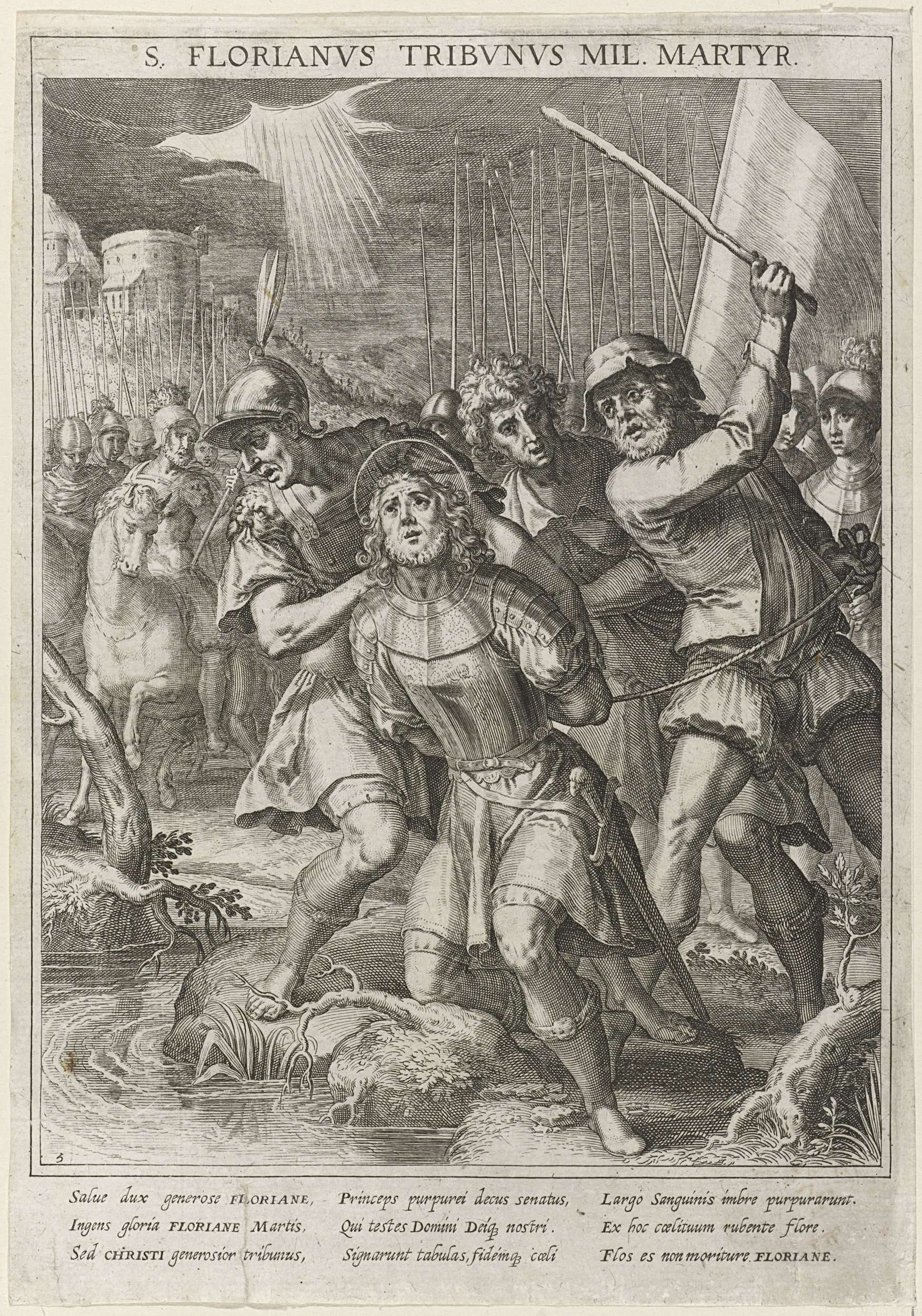 De H. Florianus van Lorch wordt aan de oever van de rivier Enns door soldaten vastgehouden en onthoofd. Aan de hemel breken lichtstralen door de donkere wolken. De prent heeft een Latijns onderschrift en is de vijfde prent van een 60-delige serie met als onderwerp de heiligen van Beieren.