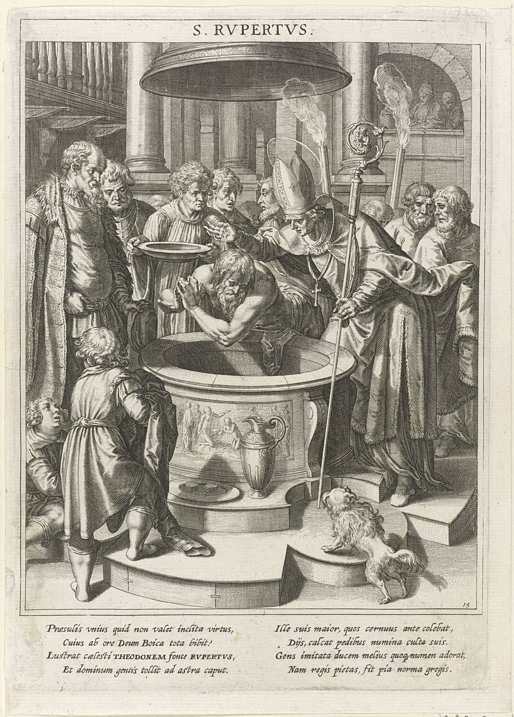 De H. Rupertus, de eerste bisschop van Salzburg, staat naast een ornamenteel doopvond in een kerk en doopt een oude man. Achter hem staan andere inwoners van Salzburg. De prent heeft een Latijns onderschrift en is de vijftiende prent van een 60-delige serie met als onderwerp de heiligen van Beieren.