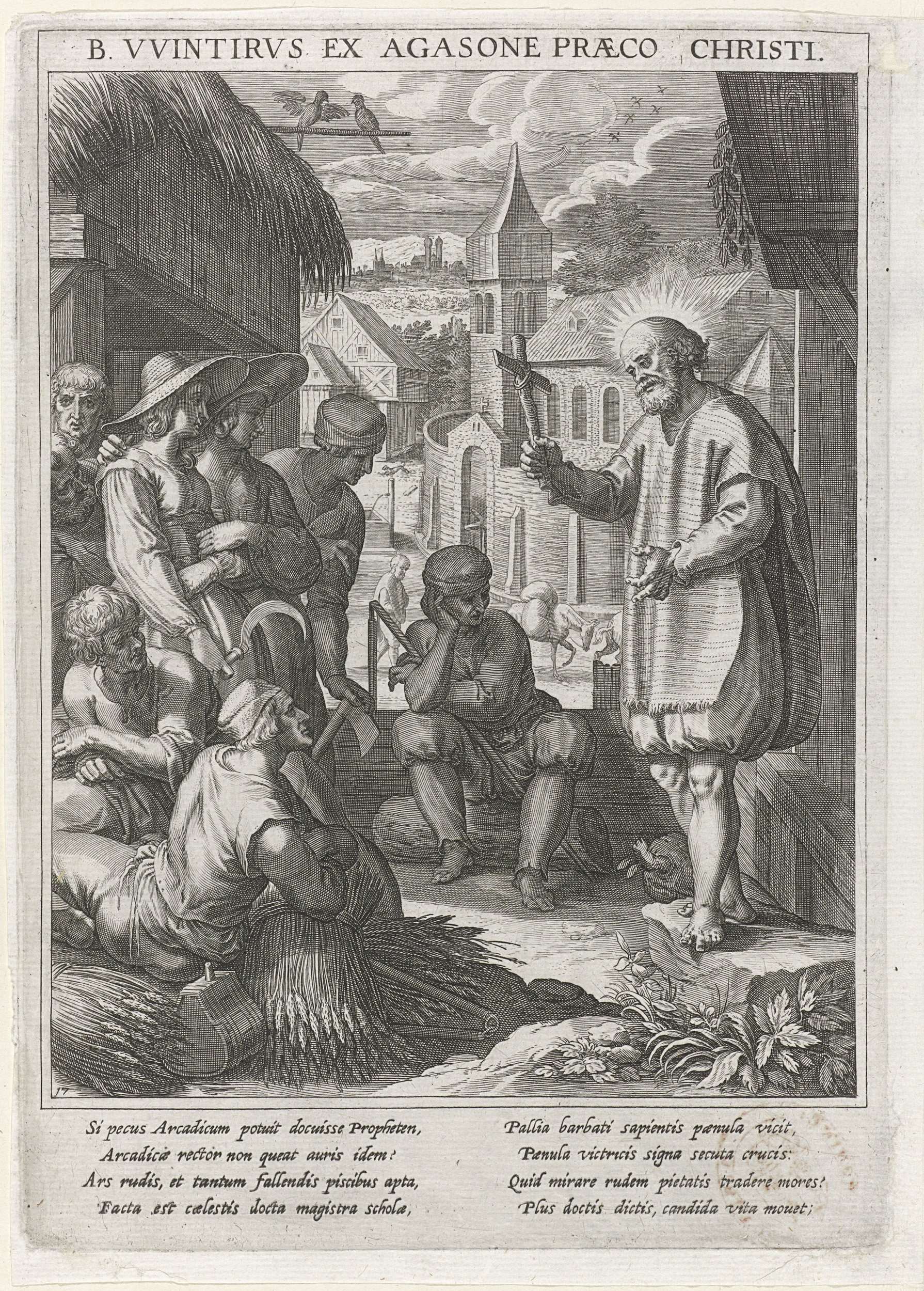De Engelse monnik Winthir van Neuhausen preekt voor een boerengemeenschap. Op de achtergrond drijft hij enkele muildieren. De prent heeft een Latijns onderschrift en is de zeventiende prent van een 60-delige serie met als onderwerp de heiligen van Beieren.
