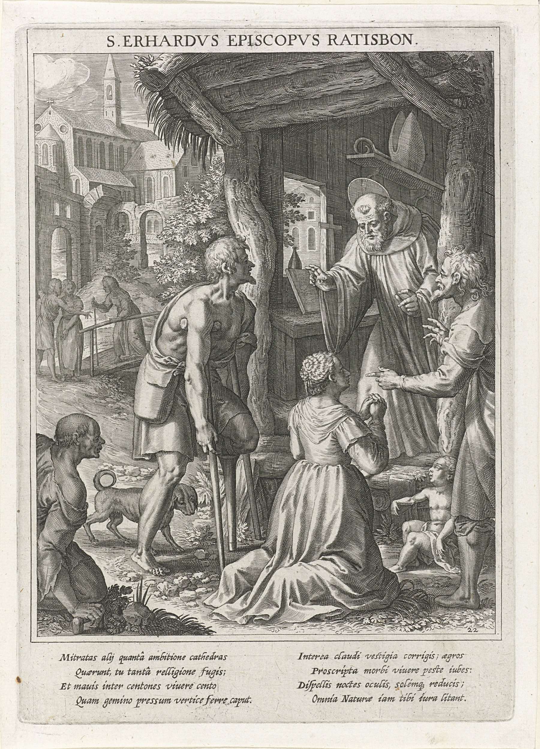 De H. Odilia van Odilienberg zit geknield voor de kluis van de H. Erhard, bisschop van Regensburg. Hij zegent haar. Naast haar staat een man op krukken. De prent heeft een Latijns onderschrift en is de tweeëntwintigste prent van een 60-delige serie met als onderwerp de heiligen van Beieren.