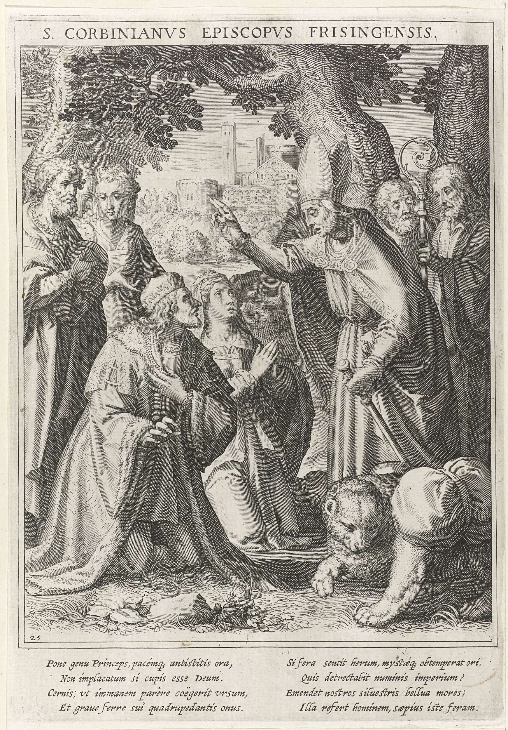 De H. Corbinianus, bisschop van Freising, staat voor de geknielde hertog Grimoald en zijn vrouw. Hij beveelt hem hun huwelijk te ontbinden, omdat de vrouw voorheen met de broer van de hertog was getrouwd. Naast de H. Corbianus een tamme beer, zijn attribuut. De prent heeft een Latijns onderschrift en is de 25ste prent van ...