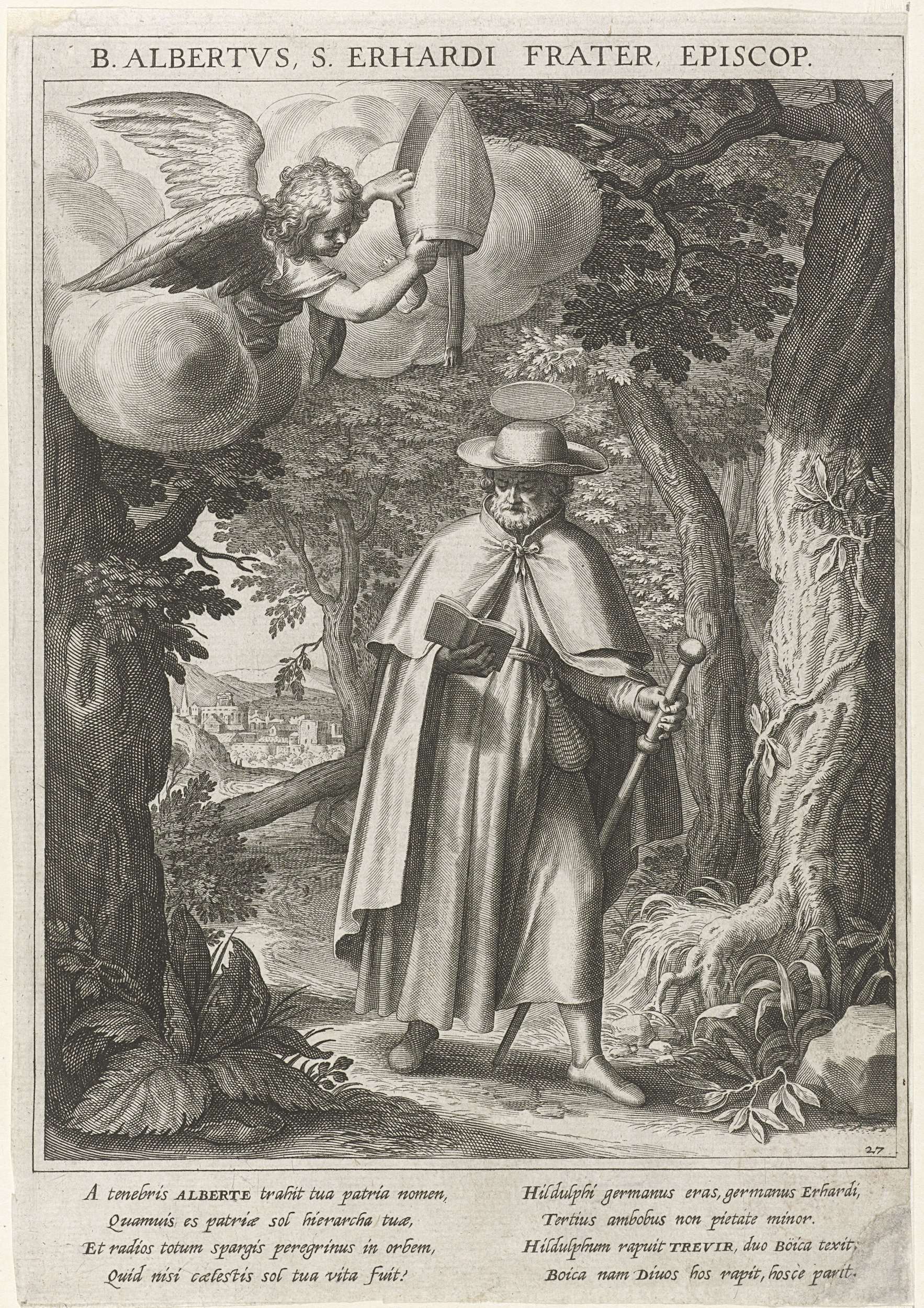 De H. Albertus van Beieren wandelt in een woud en leest een bijbel. Aan de hemel verschijnt een engel met een mijter die de H. Albertus to bisschop van Cashel verheft. De prent heeft een Latijns onderschrift en is de 27ste prent van een 60-delige serie met als onderwerp de heiligen van Beieren.