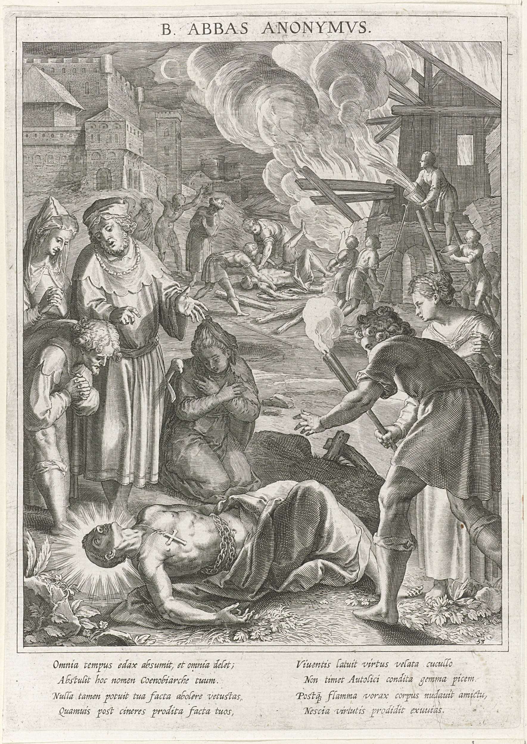Op de voorgrond wordt het intacte lijk van een anonieme abt die stierf in een brandend huis door het volk getoond aan de hertog van Beieren. Op de achtergrond wordt het huis waar de abt stierf geblust. De prent heeft een Latijns onderschrift en is de 53ste prent van een 60-delige serie met als onderwerp ...