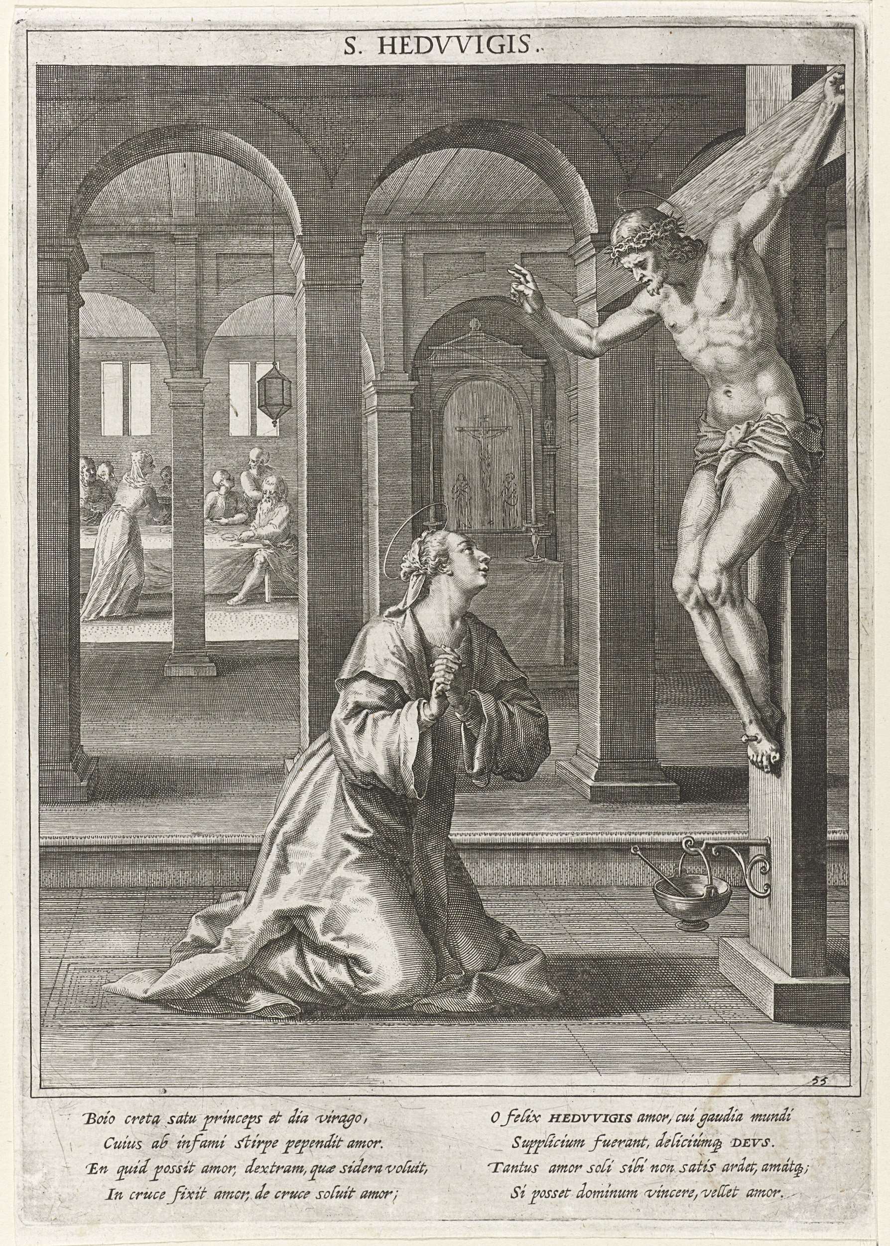 Op de voorgrond bidt de geknielde H. Hedwig van Silezië voor een crucifix van Christus. Het beeld van Christus komt tot leven en zegent de Heilige Hedwig. Op de achtergrond een maaltijd aan een tafel. De prent heeft een Latijns onderschrift en is de 55ste prent van een 60-delige serie met als onderwerp de heiligen ...