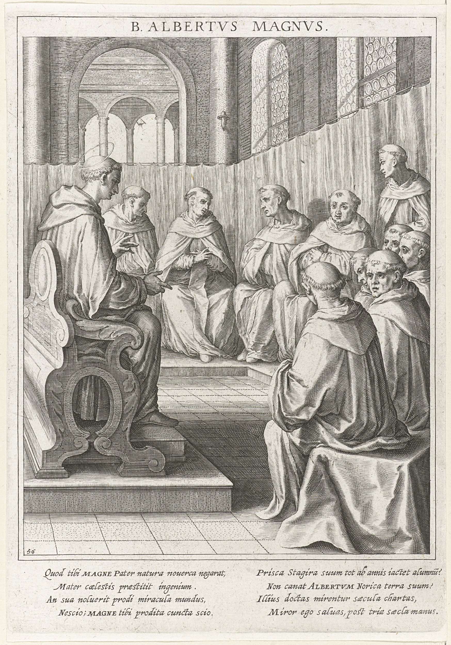 nDe H. Albertus Magnus zit op een stoel en is in gesprek met moniken in een kooster. De prent heeft een Latijns onderschrift en is de 56ste prent van een 60-delige serie met als onderwerp de heiligen van Beieren.